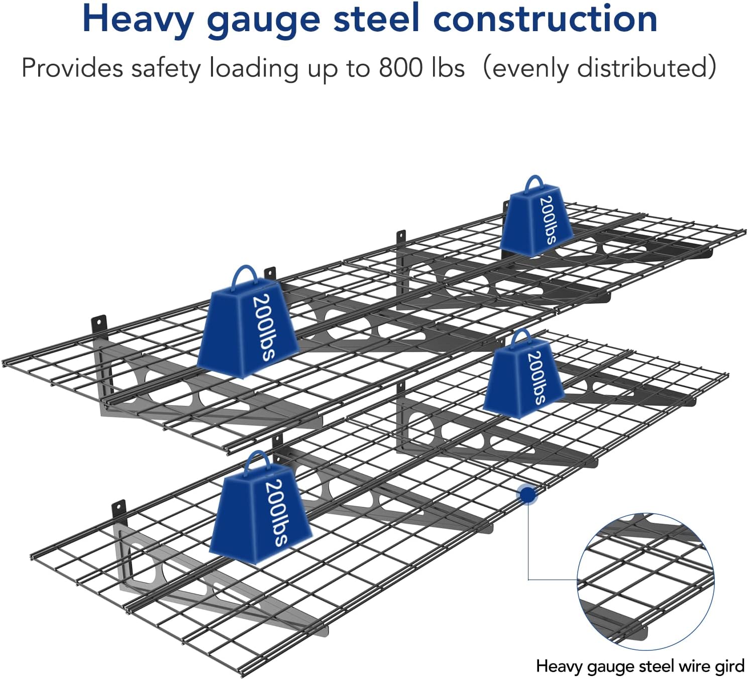 - 1600 lbs Tested, 800 lbs Total Rated Capacity: Our garage wall shelving is rigorously tested to handle a total of 1600 lbs, ensuring unmatched safety and durability. It supports up to 800 lbs in total and 200 lbs for each individual unit.