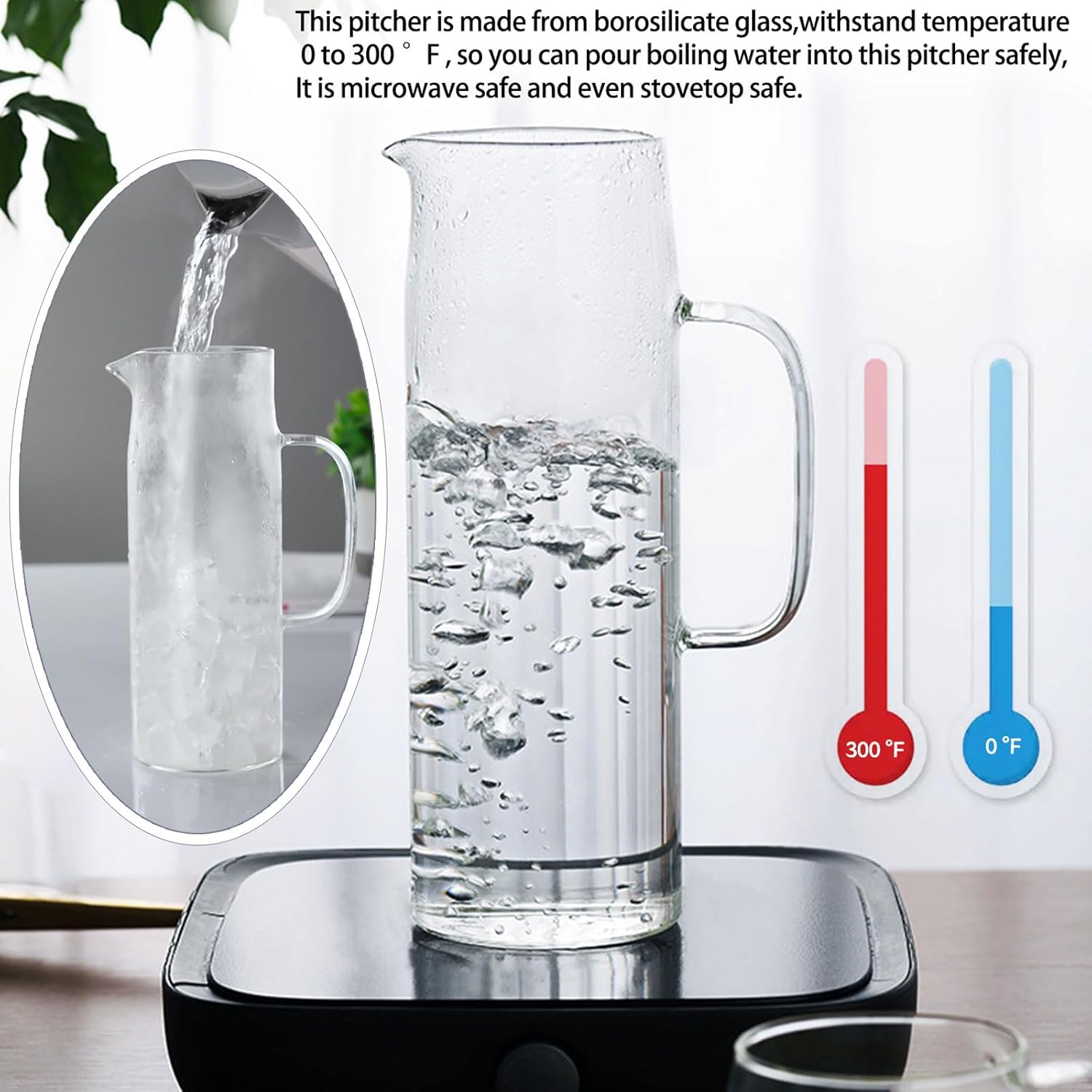 - Heat-resistant Borosilicate Glass Pitcher - This water pitcher is made from borosilicate glass, withstand temperature 0 to 300 β, so you can pour boiling water into this pitcher safely. NOTE : Each glass pitcher with a non-slip pad, which can be picked up freely .if use the pitcher for boil water on the stove, please remove the lid and pad.
