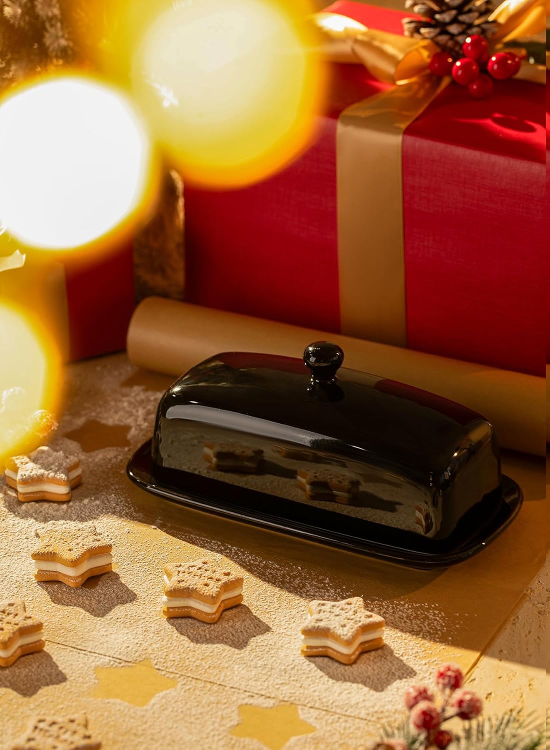 Sweese Butter Dish with Lid, Porcelain Butter Keeper, 7.8 Inch Butter Holder with Handle Cover, Butter Container Perfect for East West Coast Butter, Black