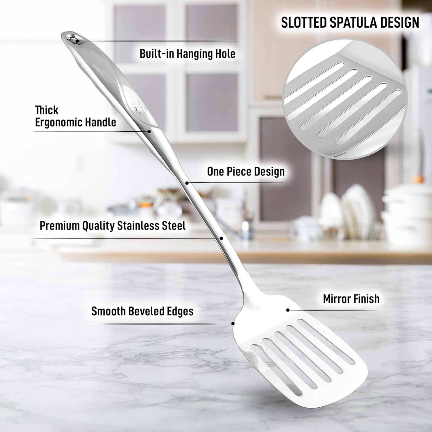- EASY TO CLEAN, EASY TO STORE: Lightweight and easy to clean. This beautiful mirror-finished stainless steel slotted turner can be washed by hand or in the dishwasher. Includes a built-in hanging hole on the handle for easy storage after use. Perfect for flipping, stirring, stir-frying, draining, and more.