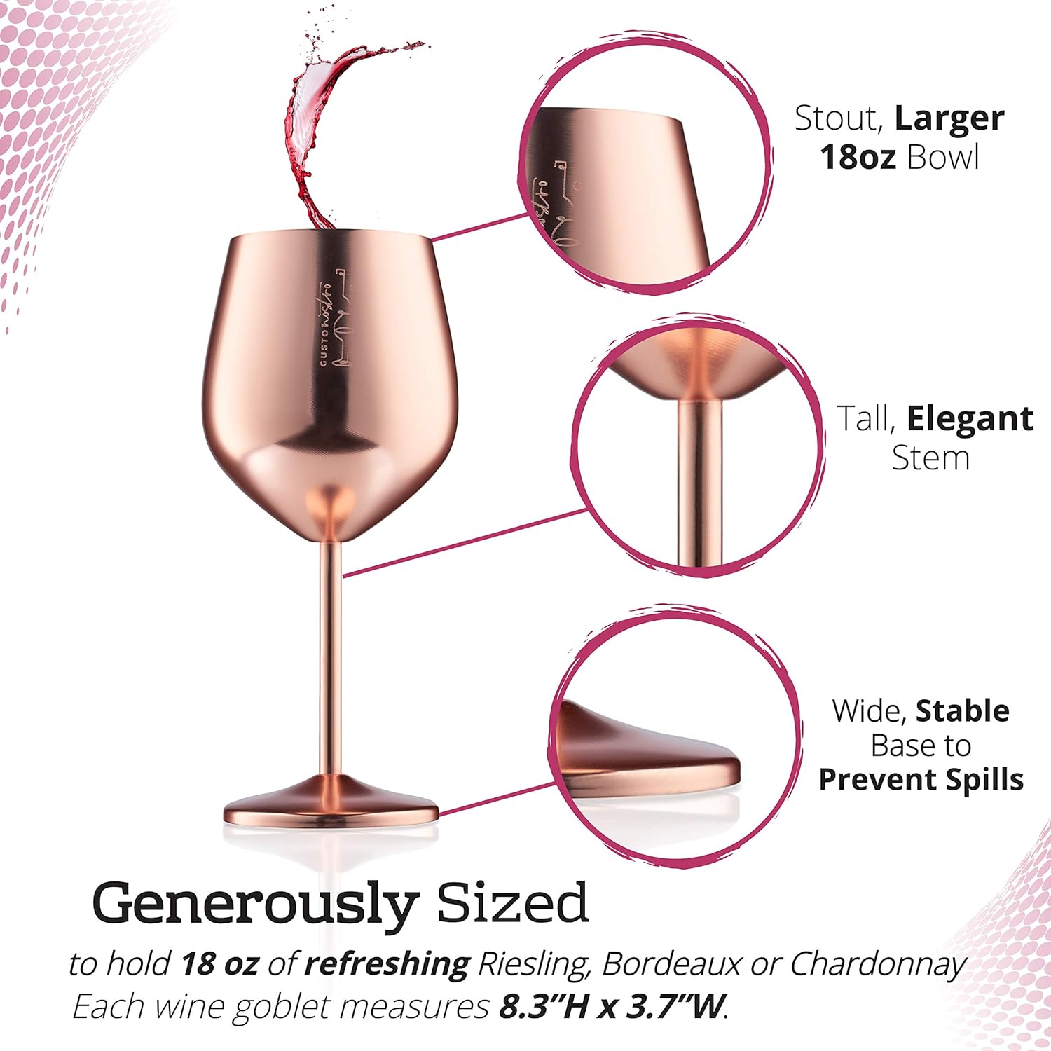 Gusto Nostro Stainless Steel Wine Glass - 18 oz - Unbreakable Rose Gold Wine Glasses for Travel, Camping and Pool - Fancy, Unique and Cool Portable Metal Wine Glass for Outdoor, Picnics (Set of 2)