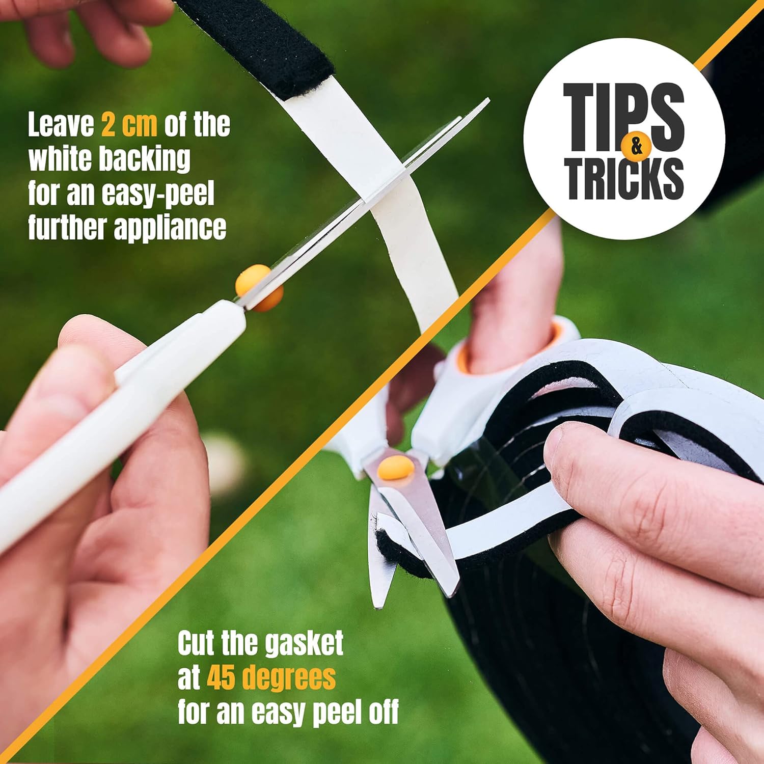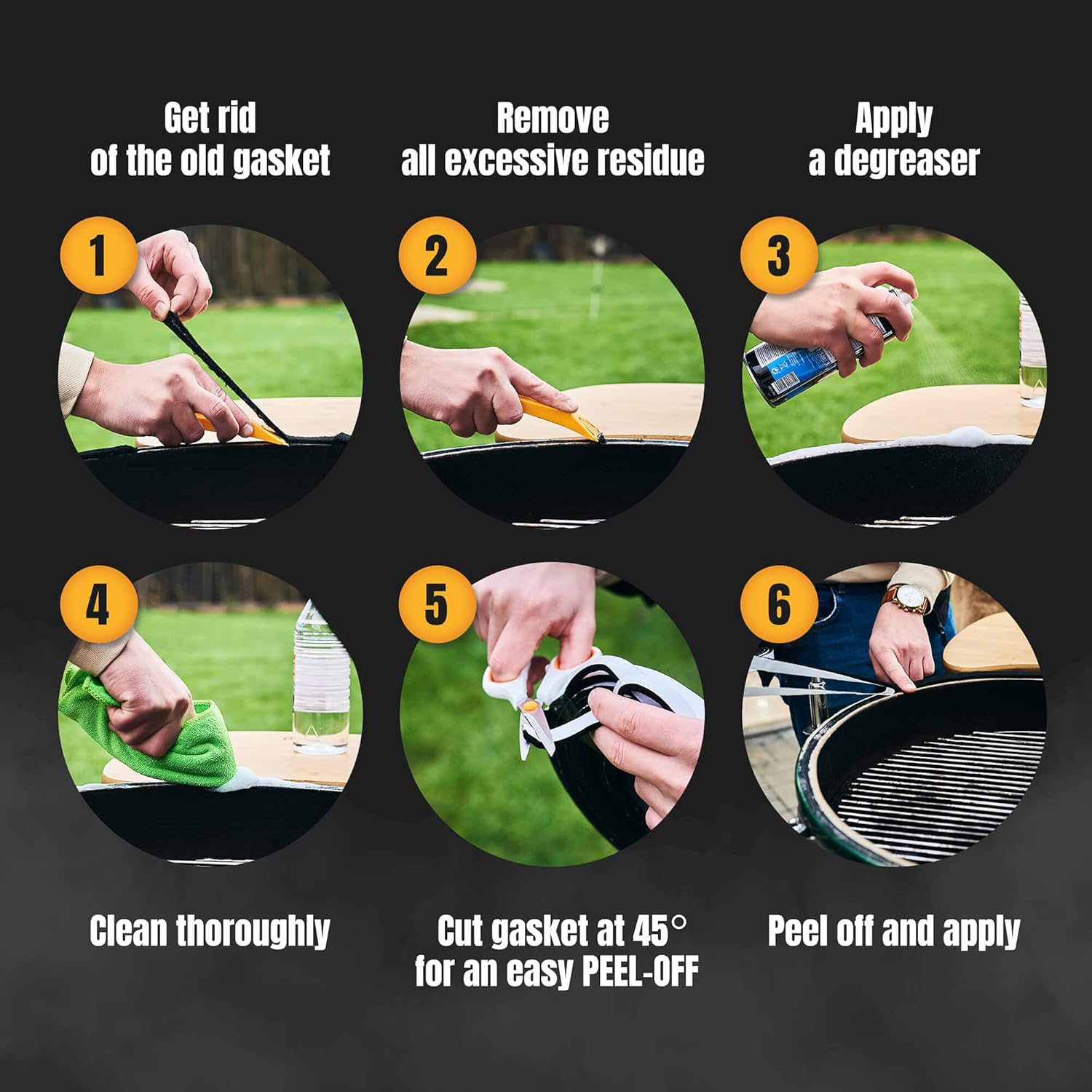 - [ HI TEMP RESISTANCE ] With strong adhesion, the self-adhesive BBQ smoker gasket is easy to stick and apply and fits the most grills: 1. Scrape / Remove the old gasket; 2. Clean and degrease the surface; 3. Peel off safe-adhesive backing (as the adhesive might be very strong, you can use an oblique cut to get rid of the paper backing); 4. Stick the gasket around the edge of the Grill and its lid; 5. Cut the excessive length; 6. Close the lid and wait for 12 hours to ensure a strong fixation.