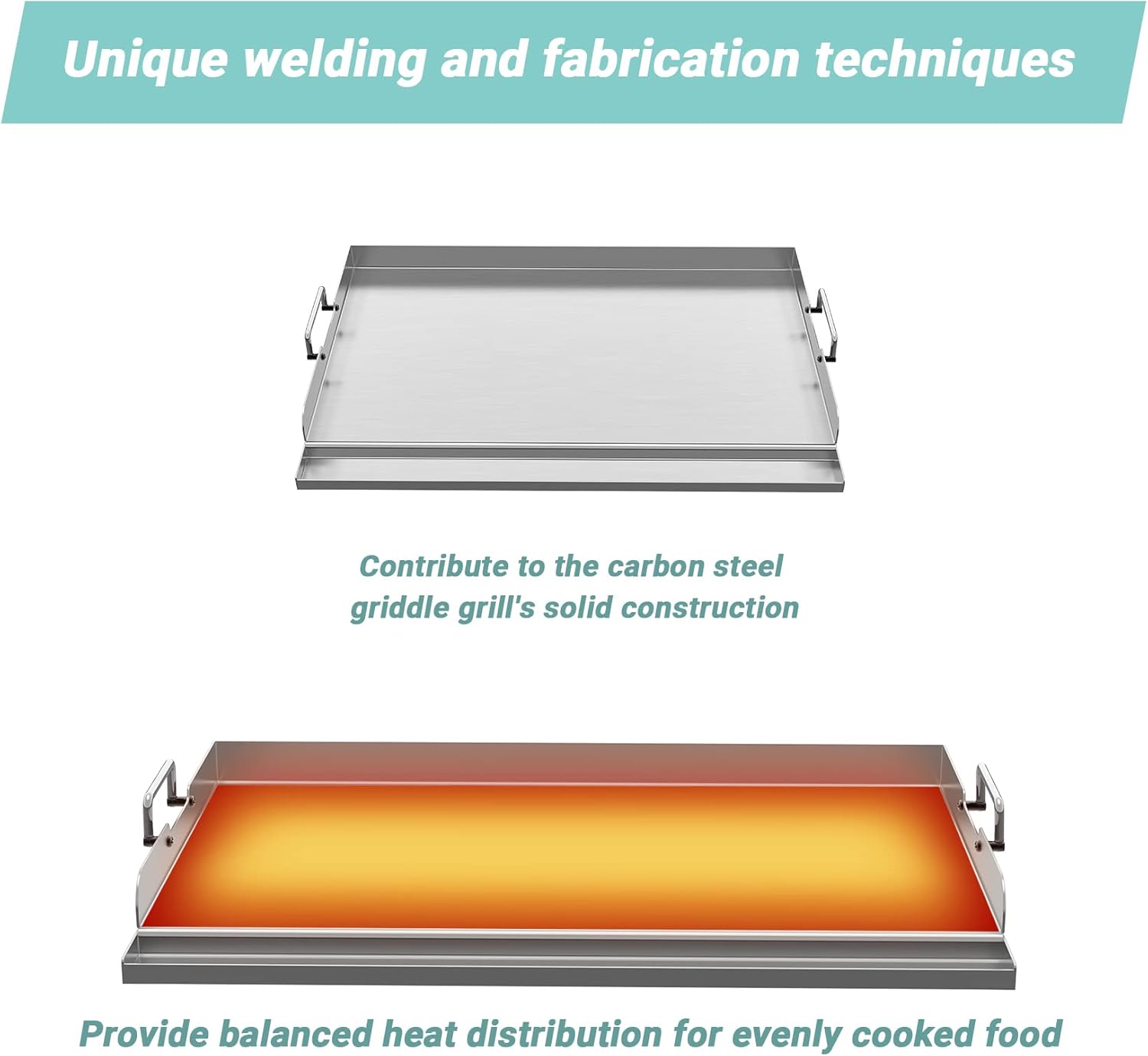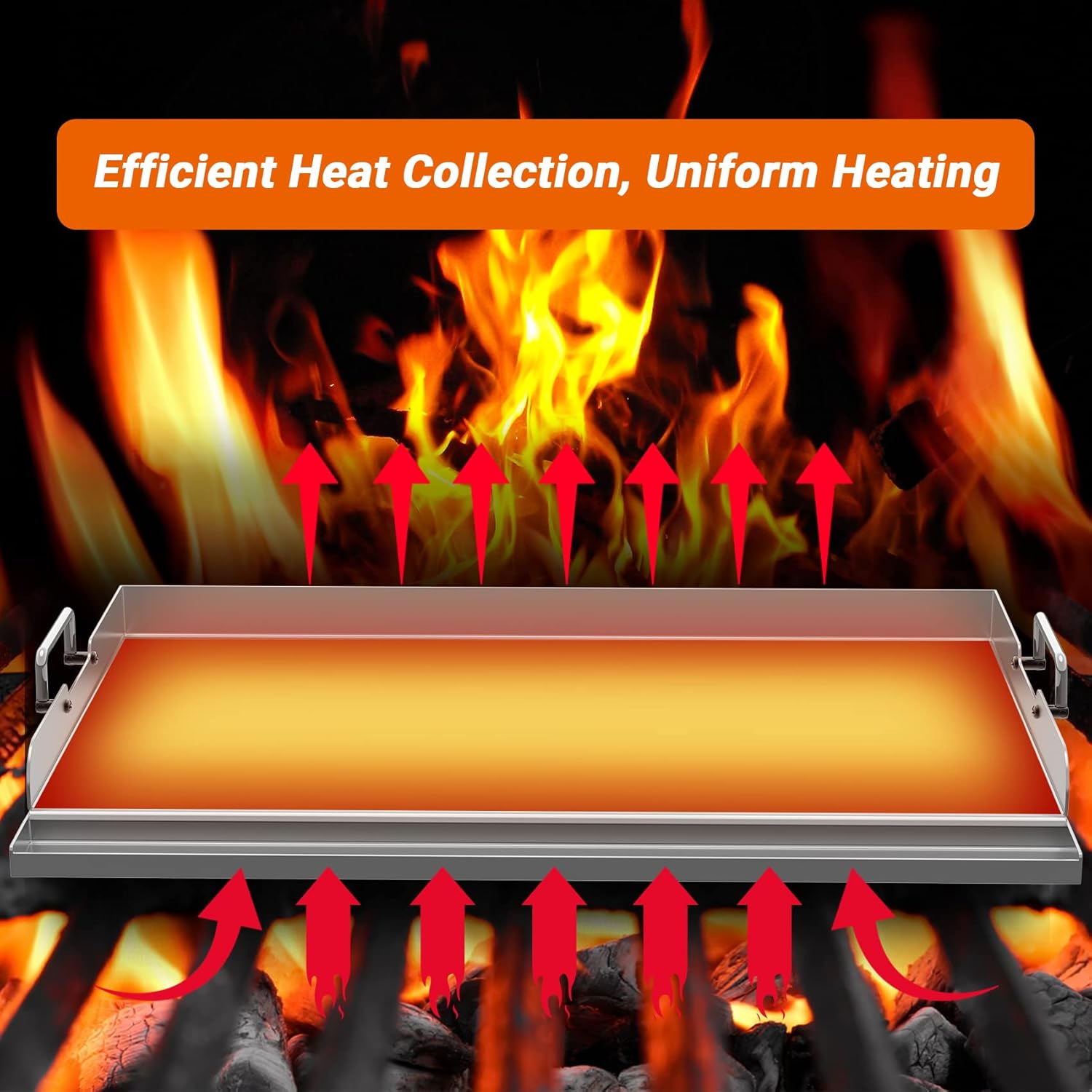 - THE X-SHAPED BACK ENABLE HEAT EVENLY - Our essential griddle stove plate underside cross-bracing promotes even heating, the raised baffle (1.3”H) can prevent oil spilling over and food splashing, and side foldable handles is sturdy and can easily lifting the plate on and off easily.