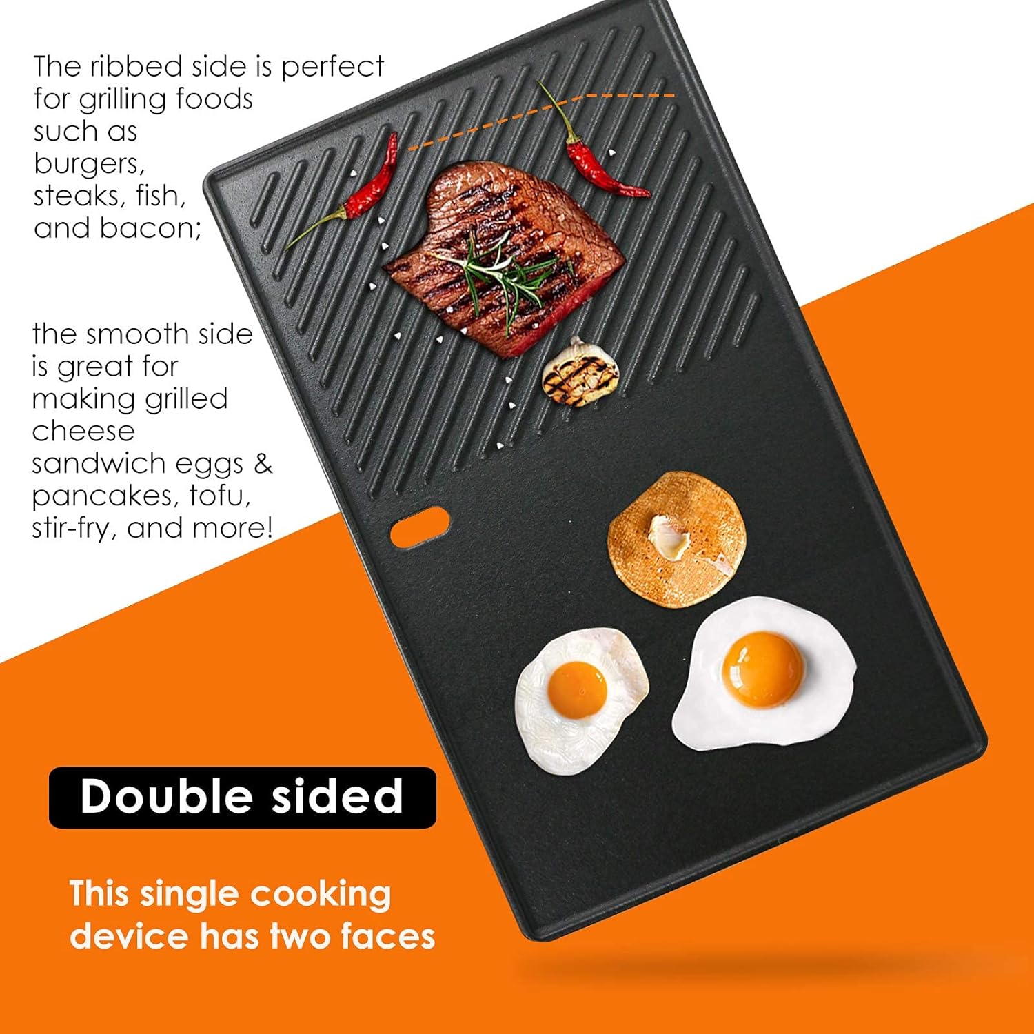 - 【Extremely Durable】- Made of durable cast iron to ensure long-lasting use. Do not chip or rust out like the enameled bars, more durable and leave beautiful grill marks on the food 【Non-Stick & Easy to Clean】-Barbecue with cooking oil for grilling/cleaning with hot water brush after air drying can prevent food from sticking to the griddle【Excellent material】The reversible grill and griddle is made from cast iron metal with a nonstick surface and ensures quick, effortless food release