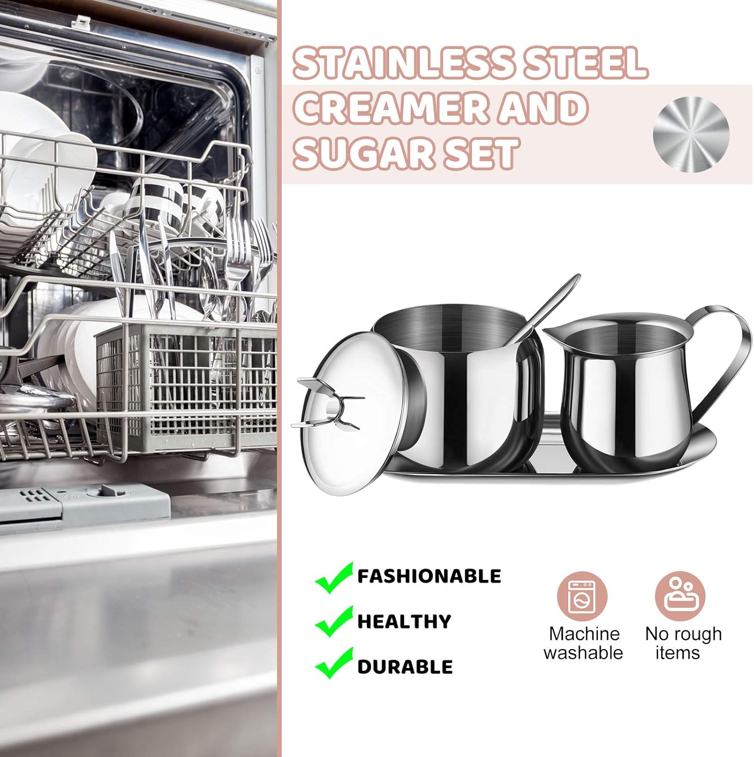 Creamer and Sugar Bowl Set Stainless Steel Latte Milk Cup Cream Jug and Sugar Bowl with Lid Spoon Tray for Coffee Serving Set Frothing Milk