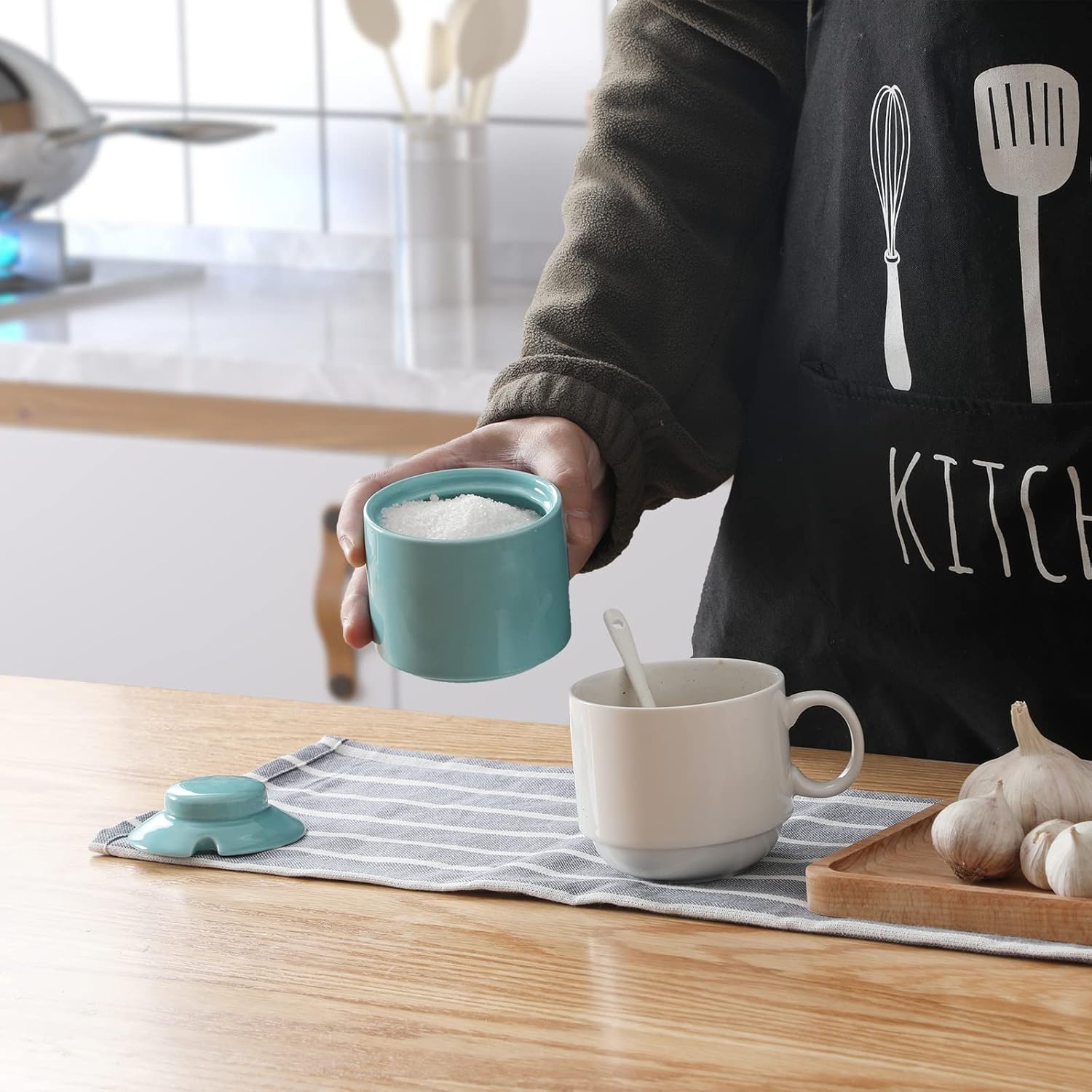 ONTUBE Ceramic Sugar Bowl with Lid and Spoon,Porcelain Seasoning Box Salt Bowl,8oz (Turquoise Blue)