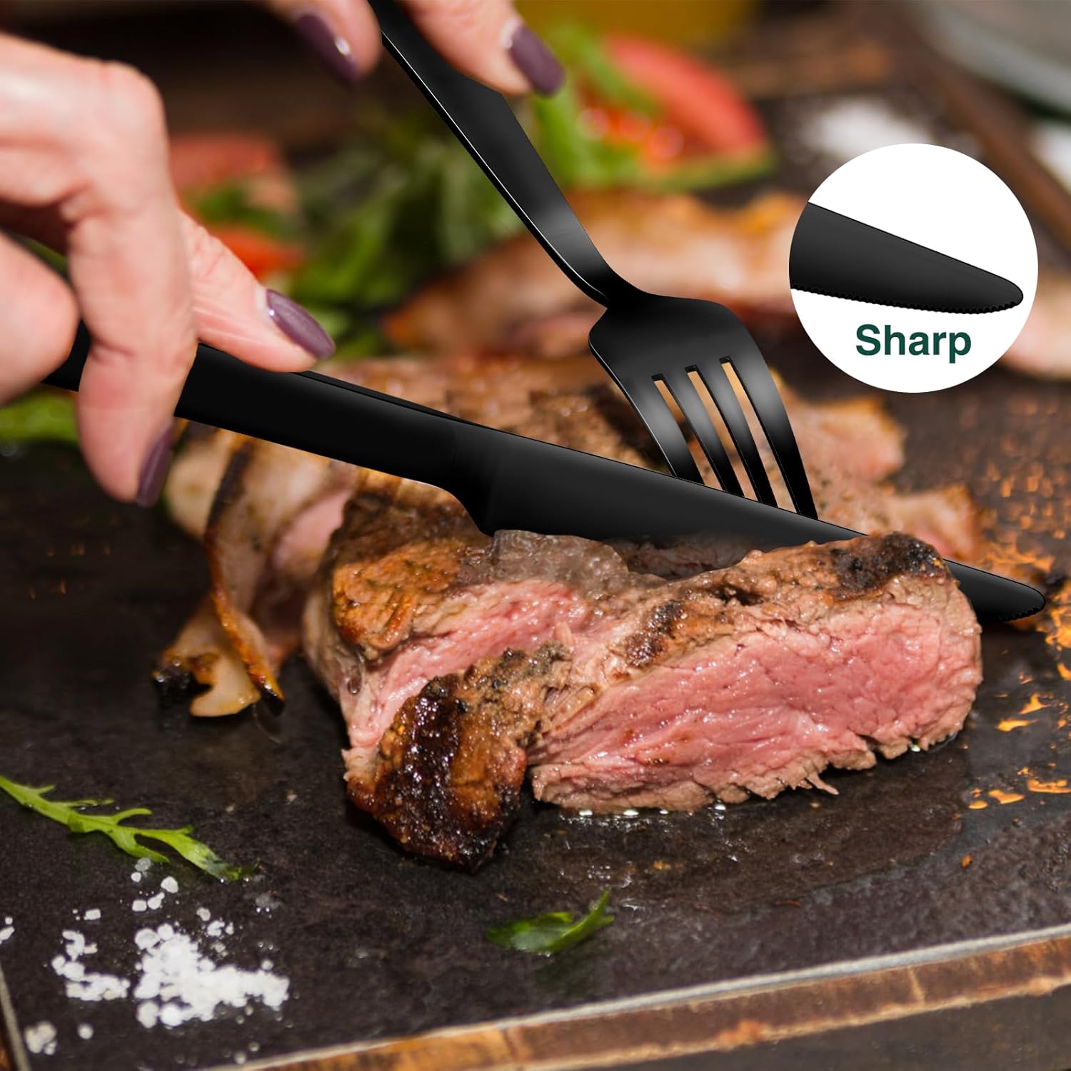 - BLACK FLATWARE SET FOR 12: 60-piece set of stainless steel flatware for everyday use or casual & special occasion. This silverware set includes 12 dinner spoons, 12 dinner forks, 12 dinner knives, 12 salad dessert forks, 12 teaspoons. It would be a nice set of tableware to serves guests and family members.