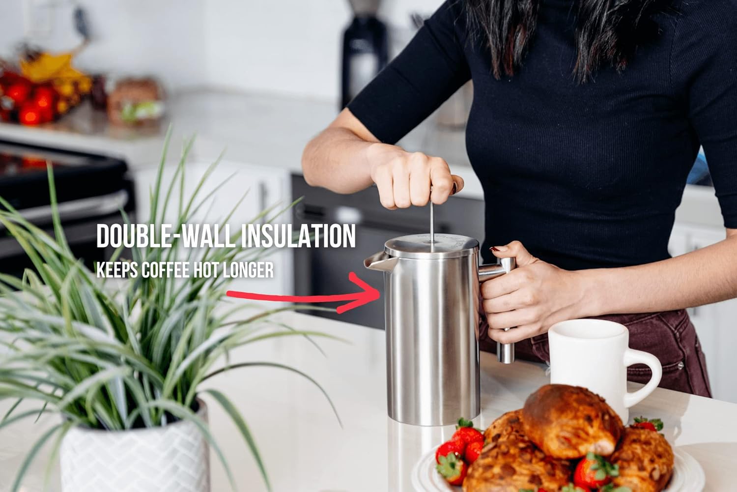 - KEEP COFFEE HOT LONGER: Brewer insulated design helps in keeping your coffee hot for 1 hour longer than glass. No more coffee getting cold by the second cup! Our vacuum insulated coffee press is constructed with a double-wall stainless steel metal design which provides excellent insulation between cups. It keeps your coffee hot and fresh for a long time while keeping the exterior cool to the touch!