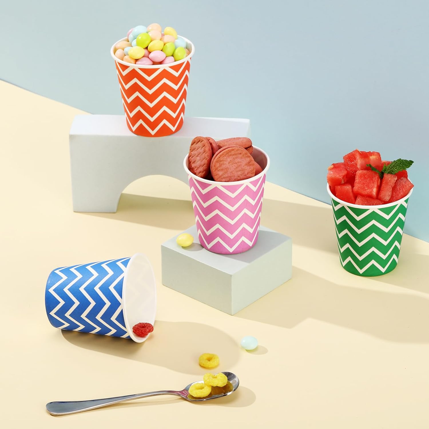 - UNIQUE DESIGN - Assorted Colors disposable paper cups with cute strip patterns are easy to attract attention. Compared with white paper cups, bright colors let you feel happy and better decorate your home or party. 500 packs paper cups bulk can be used for a long time.NOTE: If the cups stick together, you can rotate the stacked cups by hand to solve the problem.