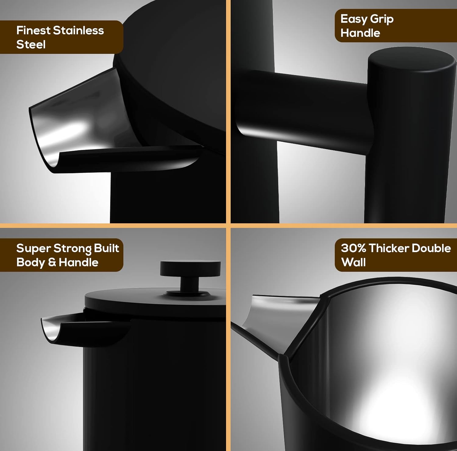 - Sleek Stainless Steel – The coffee maker is created using 304 grade stainless steel, with a smooth and durable finish and carefully designed to give you the French press you need.