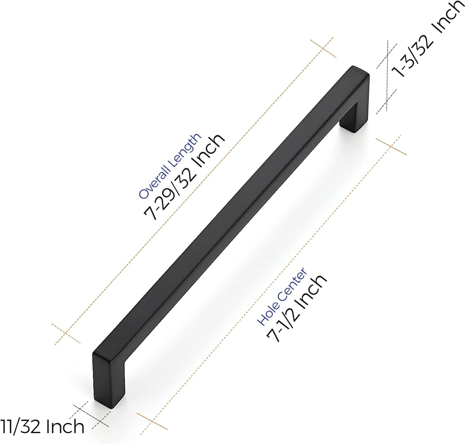 - Size of Cabinet Pulls: Screw-hole center: 7-1/2 inch(192mm). Overall Length:7-29/32 inch(201mm); Width: 11/32 inch(9mm); Projection: 1-3/32 inch(28mm)