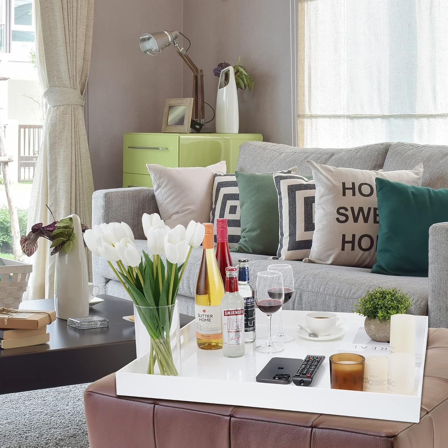 24×24 Inches Glossy White Acrylic Serving Tray with Handles Extra Large Ottoman Tray Decorative Trays Spill-Proof Coffee Table Space Saver Oversize Counter top Organizer Platter with Safe Edge