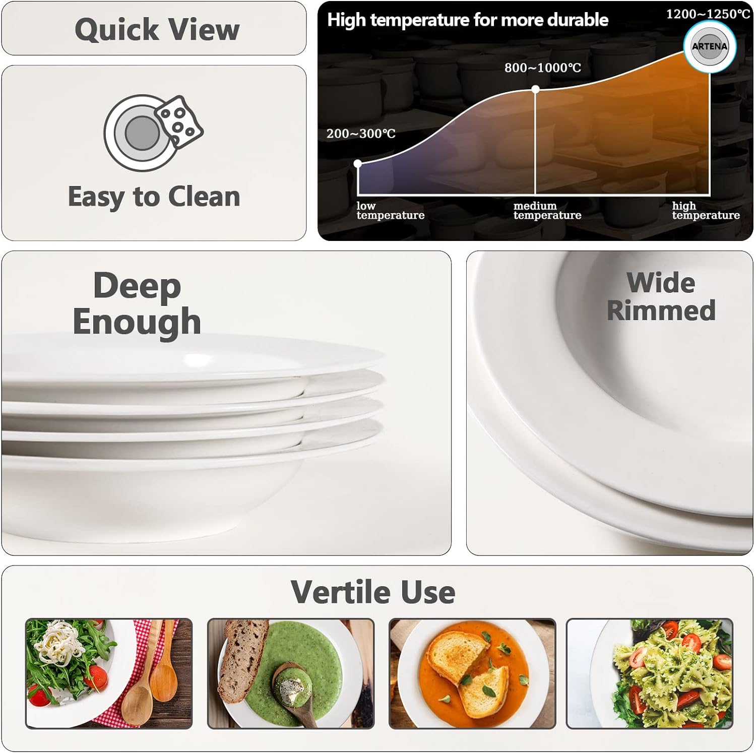 - 【CLEAN LINES AND ELEGANT WHITE COLOR】Thia soup bowls are sturdy and durable, with modern touches, and match it with anything. The basic white color is perfect for everyday use. Classic clean lines never go out of style. Non yellowing, non blackening, doesn't scratch with the use of metal utensils rubbing against the surface. Stacks well and fits easily in the plate rack in the dishwasher. Dishwasher-, freezer-, microwave- and oven-safe