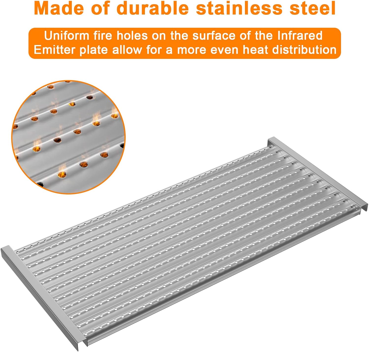 - 【Heat Evenly】The uniform fire holes on the surface of the Infrared Emitter plate facilitate an even distribution of heat across the cast iron grate, ensuring optimal flame heat exposure for your food.