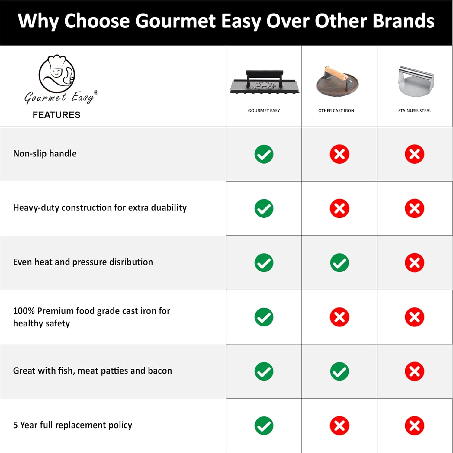 - GREAT GRIDDLE ACCESSORY! Gourmet Easy high-quality grill press for smash burgers is engineered for equalized weight distribution and high heat that locks in the flavor of your meat. It can be used on grills, grates, gas, electric, and induction stoves. This is a must-have grill accessory for outdoor grills backed by an UNCONDITIONAL 5-YEAR WARRANTY.
