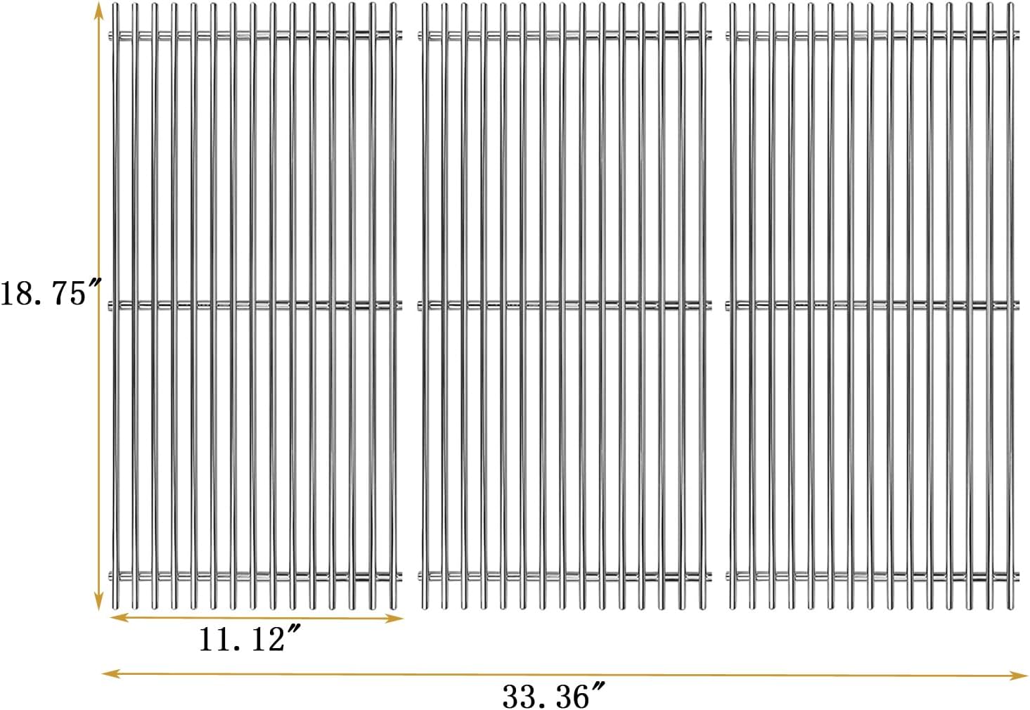 - 【Package】Including 3 pack stainless steel cooking grates,dimension: 18.75" x 11.12" for each grate, 18.75" x 33.36" for total. Comes with 3Pcs 304 Stainless Steel grill grates. Please kindly compare with the SIZE and MODEL of your original parts before you order