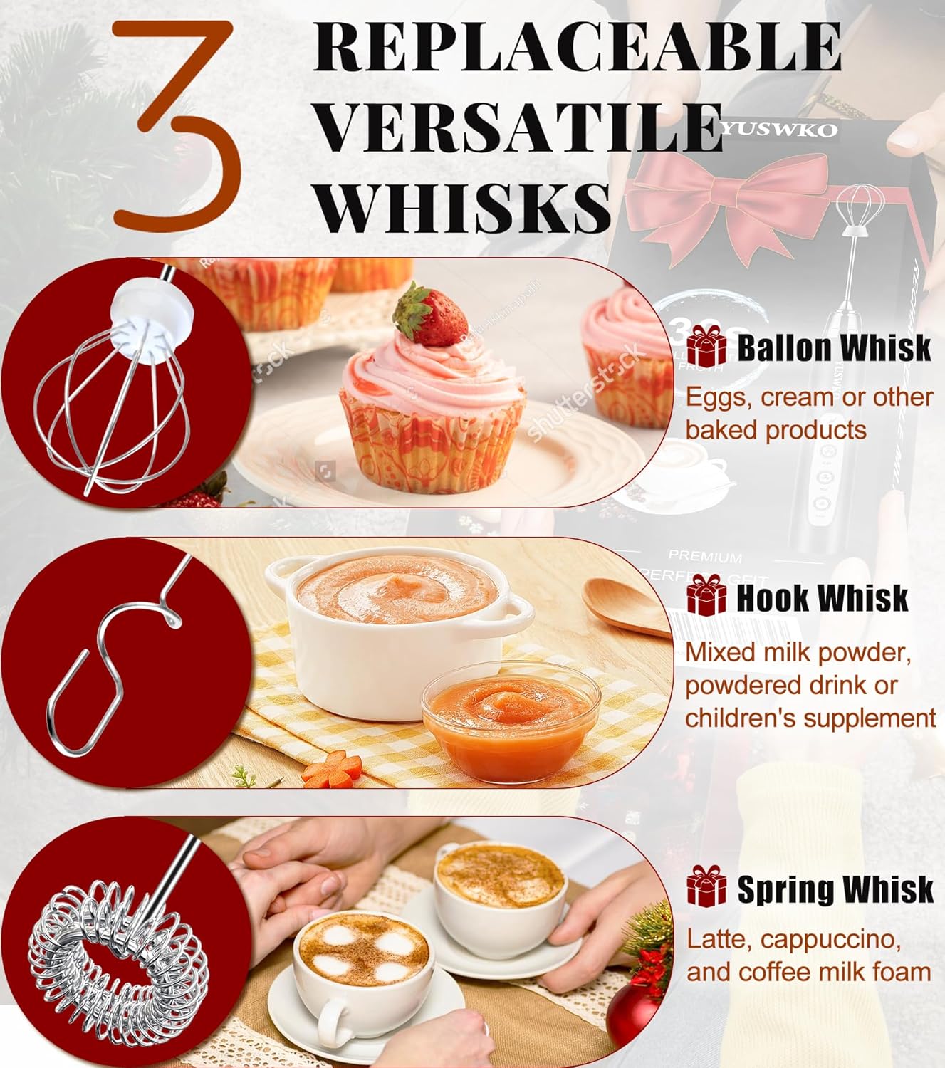 YUSWKO Milk Frother Handheld for Coffee with Stand, Rechargeable Drink Mixer with 3 Heads 3 Speeds Electric Coffee Frother Whisk, Gift for Many Occasions and Festival