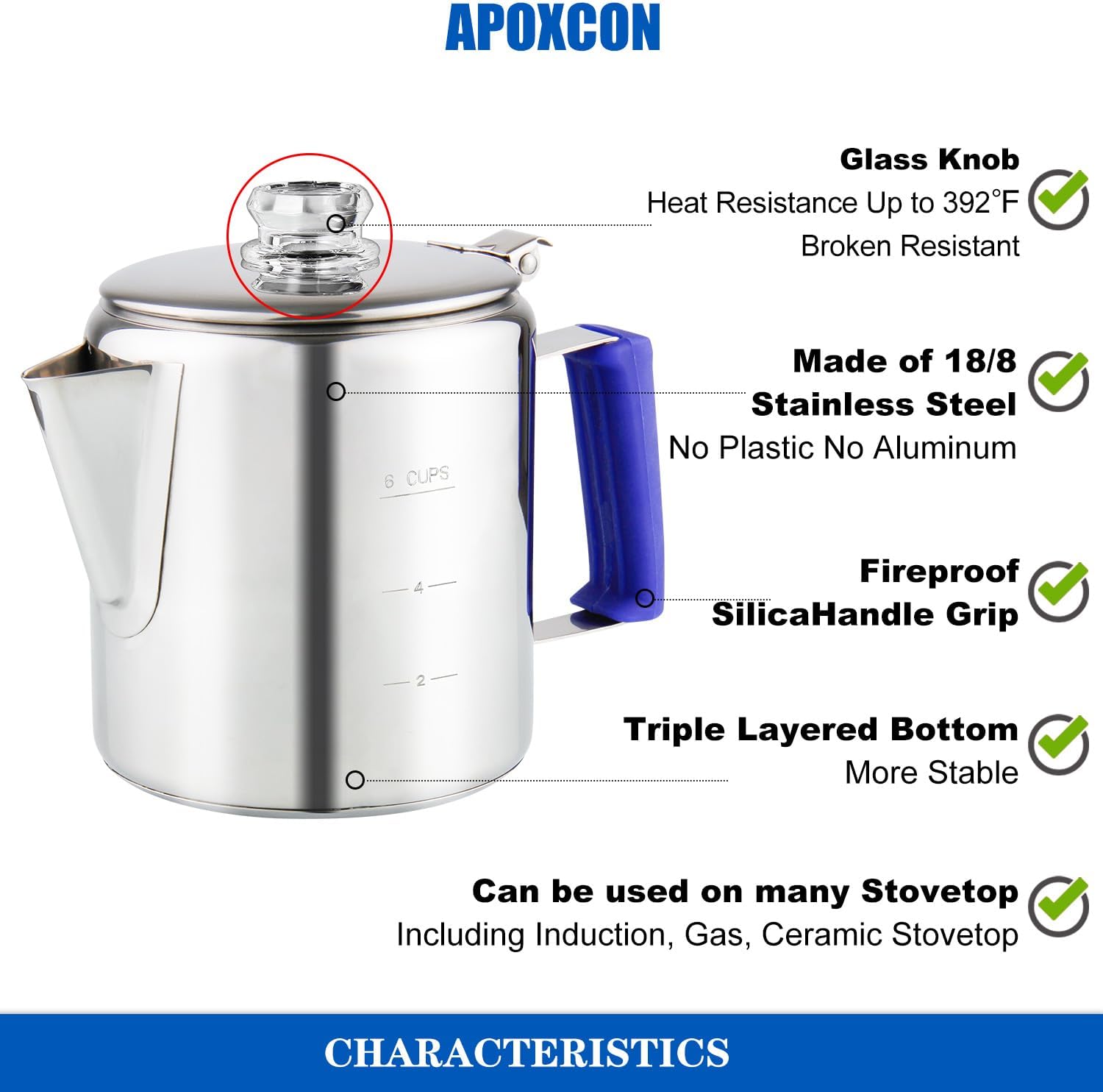 - ăTEMPERED BOROSILICATE GLASS KNOBă This coffee percolator comes with two tempered borosilicate glass knobs. The tempered borosilicate glass knob can not only withstand temperatures from 0 ° F to 392 ° F, but also has stronger pressure resistance than simple glass, making it reliable and safe to use.