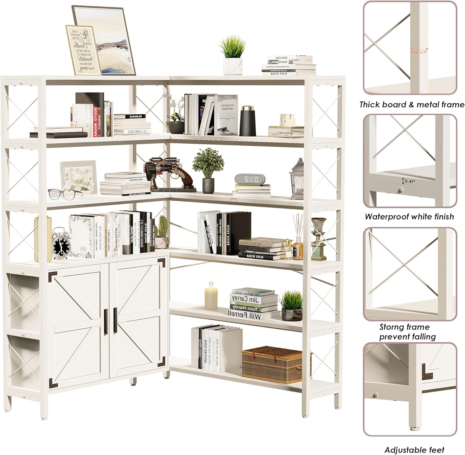 - â ăSOPHISTICATED MEETS PRACTICALăTogether with the white wood and matte white steel frame, this sleekly-designed, warm-toned corner bookcase gives your home or office a touch of industrial charm while keeping your space free of clutter. Fill the book shelf with eye-catching knick-knacks, and it will definitely become a centerpiece of your home.