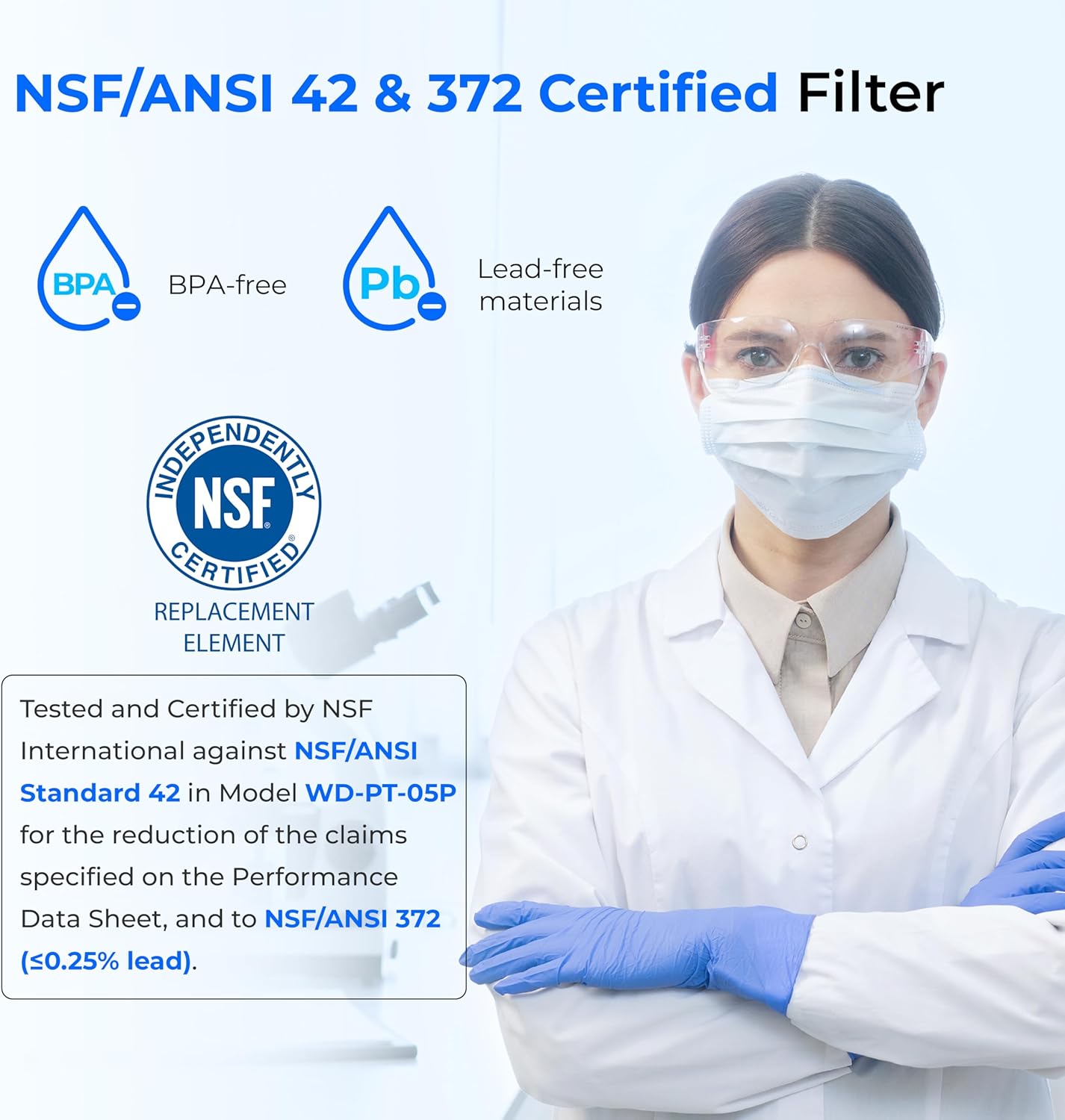 - [Authoritative Certified Filtration] The filter used in this water filter system has been tested and certified by NSF International against NSF/ANSI Standard 42 & 372. It can efficiently reduce chlorine, taste and odor, rust, sand and sediments, tested by a third-party lab, providing clean, pure water for you.