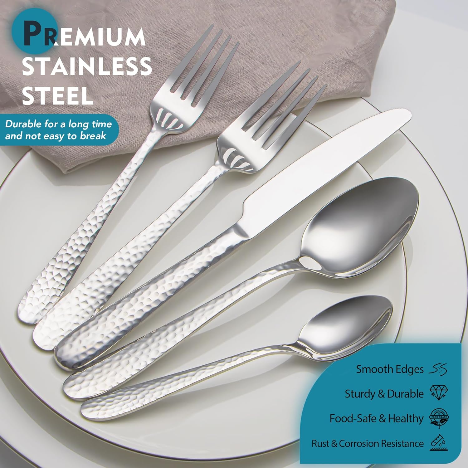 - 【Dishwasher Safe Silverware Set with Exquisite Workmanship】Highly mirror polished, smooth and shiny metallic sheen make cleaning effortless, each piece was carefully polished without rough edges and gaps, ensure the safety of your lip. Hammered pattern on the handle provides a solid grip and the texture that we think most people will find comfortable. Whether you choose to hand wash and dry, or machine wash, our kitchen utensils remain spotless without rusting or dulling