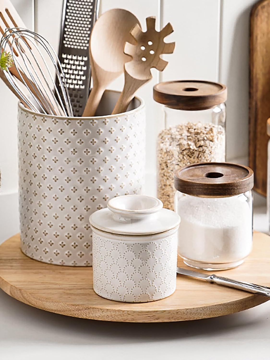 - Exquisite Counter Decorations: Featuring an arctic white glaze adorned with a charming embossed pattern, this farmhouse-style ceramic butter crock will infuse warmth and vitality into your counter. Its cute and elegant design suits various home styles. It's also the ideal present, whether for a housewarming celebration, Thanksgiving, Christmas, or a birthday, it will be an amazing choice