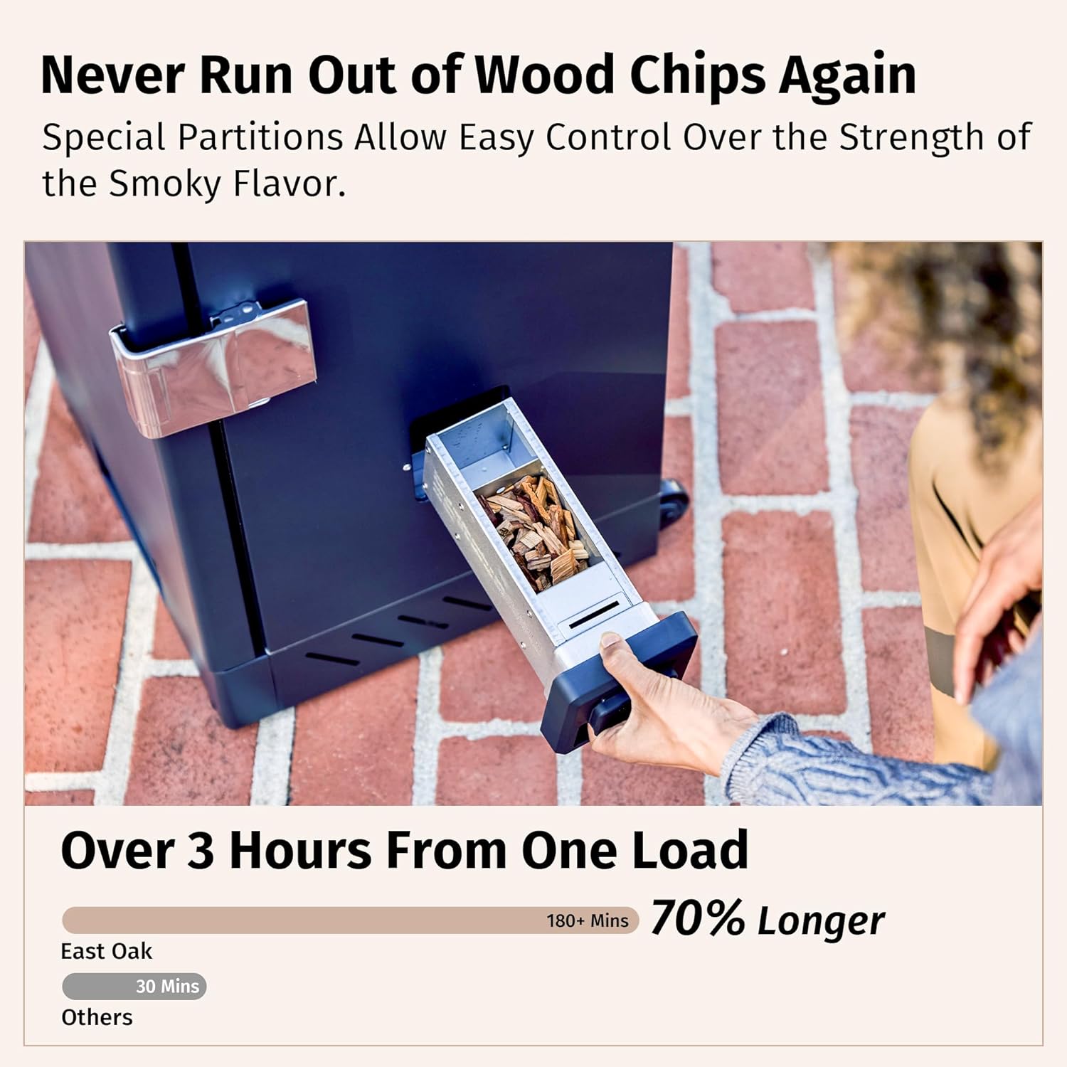 - š¢š»š² šš¶š¹š¹, šš²ššš²šæ š¦šŗš¼šøš²šæ šš¹š®šš¼šæ: The smoker features a side wood chip loader for continuous smoking for 2-3 hours without opening the door and adding chips, preserving the internal heat, and locking in the smoked flavors