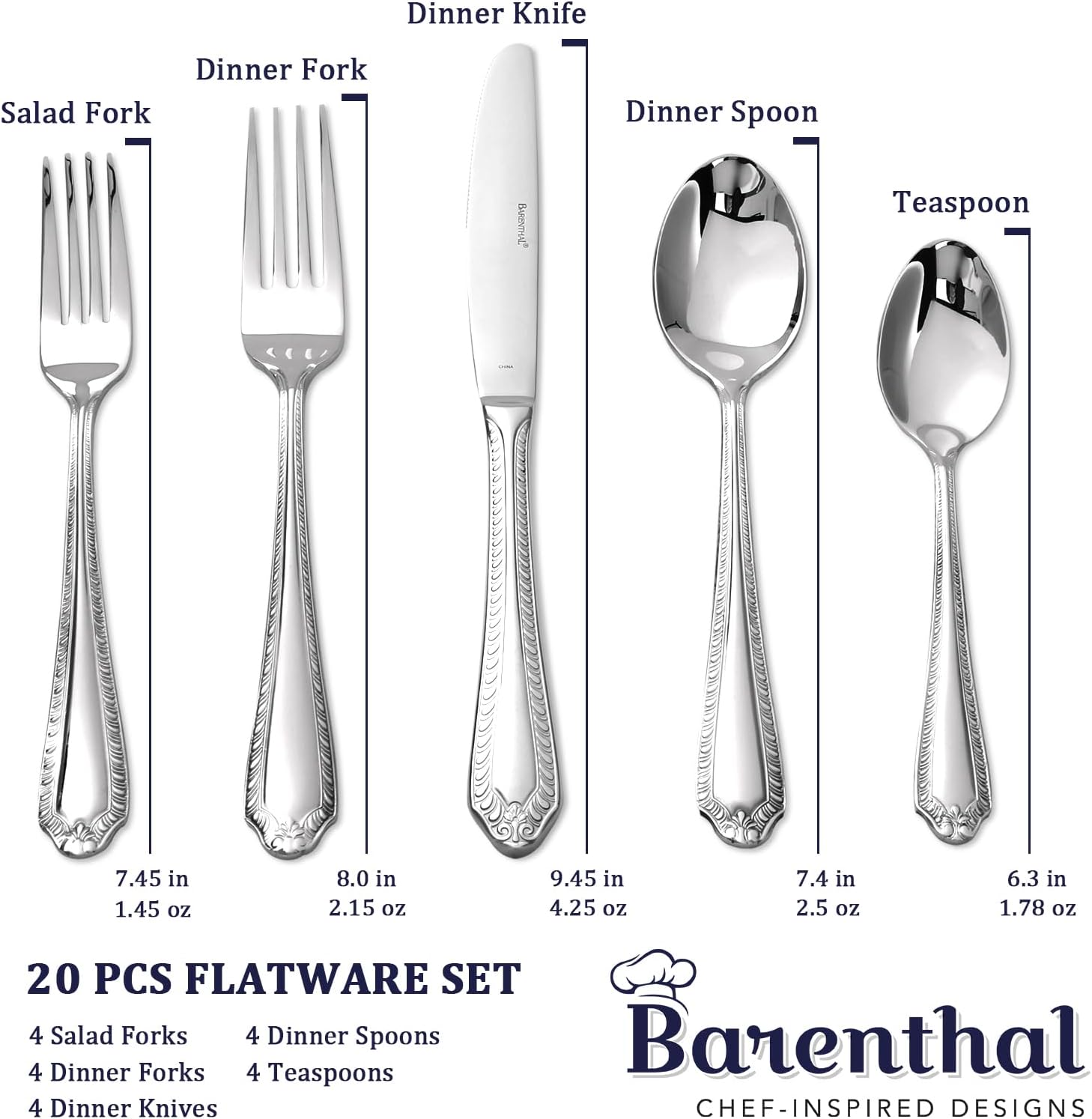 Heavy Duty Silverware Set for 4, Barenthal 20 PCS Luxury Retro Flatware Set Mirror Finish Dishwasher Safe, 18/10 Stainless Steel Silverware Flatware Sets for Home Restaurant Party Christmas Gift