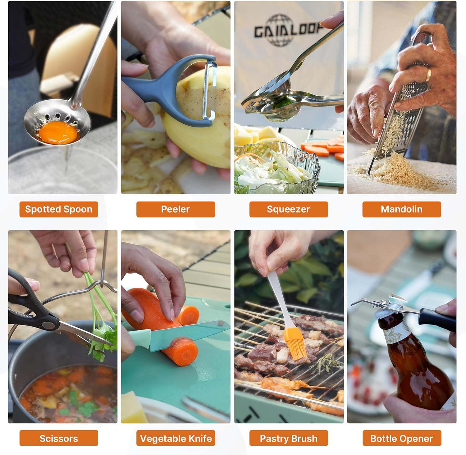 - 【Cookout Essential: RV/BBQ/Camping】Gaialoop 16 PCS Cooking Utensil Set covers most of the cooking utensils you will need in a cookout scene, excellent cooking equipment on the go. It can be used in a RV kitchen, a backyard barbecue parties or a family camping trip. This is a must have camping cooking accessories for people who enjoy glamping with friends or families.