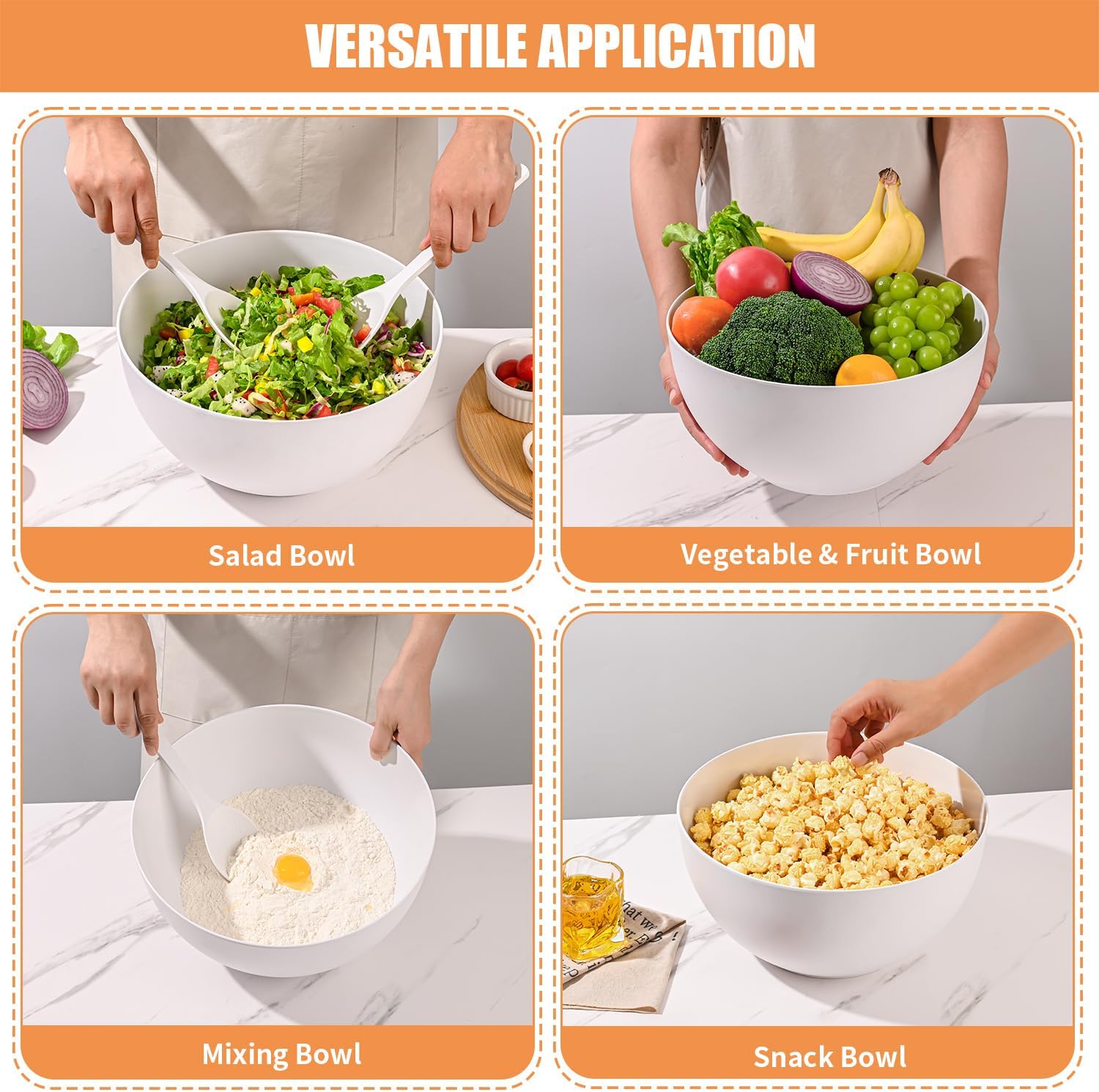 - Versatile Use: large salad bowl with lid can also be used for salads,fruits,pasta,popcorn and a variety of doughs, baking. Whether for a picnic, a potluck, a daily meal at home or gift-giving, this salad serving bowls is a practical and stylish choice that can adapt to different occasions and nee
