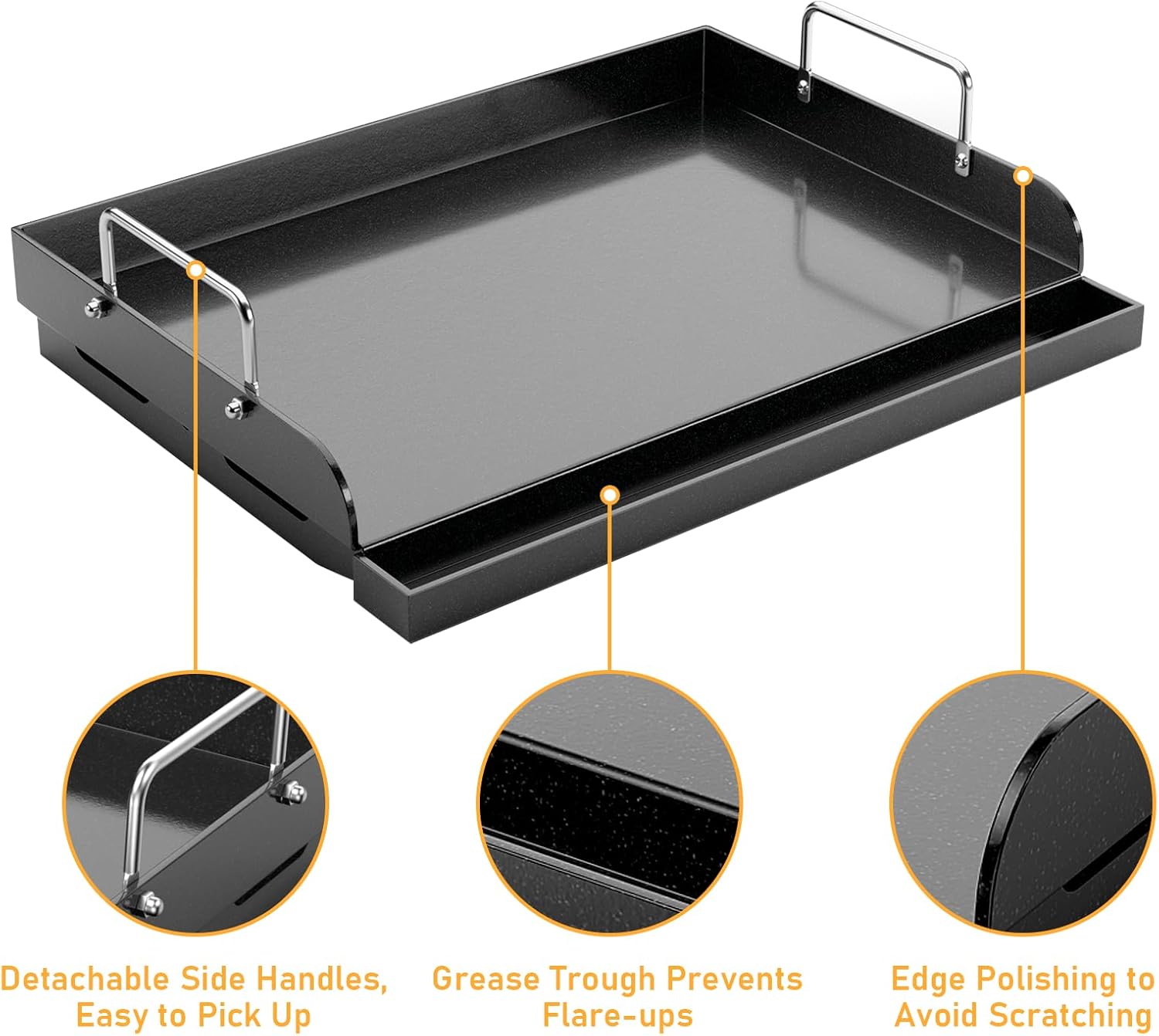 - Enhanced Features: 1. Upgraded Thickness: Prevents bending or warping during prolonged use. 2. Reinforced Support Ridges: Ensure stability and uniform heat distribution, eliminating hot spots and warping issues. 3. Detachable Handles: Convenient side handles make it easy to lift, carry, or store. 4. Built-In Grease Trough: Collects drippings to prevent flare-ups and makes cleanup effortless. 5. Polished Edges: Safe, smooth edges eliminate the risk of scratches during use