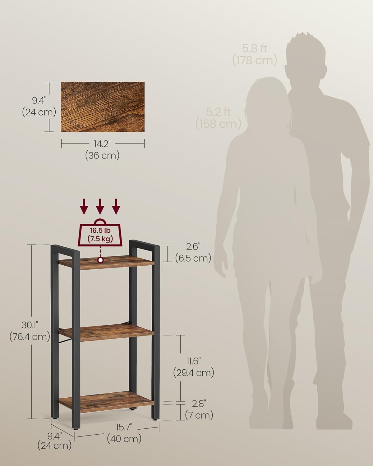 VASAGLE 3-Tier Bookshelf, Bookcase with Steel Frame, Book Shelf for Living Room, Home Office, Study, 9.4 x 15.7 x 30.1 Inches, Industrial Style, Rustic Brown and Ink Black ULLS098K02