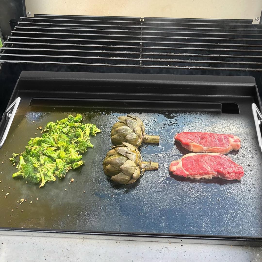- 【Features】The inserts griddle is closer to the fire source and heats up more easily than other griddles placed on the grates to achieve the temperature needed to cook delicious food. Before use, please remove the grate & emitter plates to achieve closer to the heat source. The surface of the baking pan is made of coating, durable and easy to clean, need to be heated and oiled 1-2 times before use for better results.