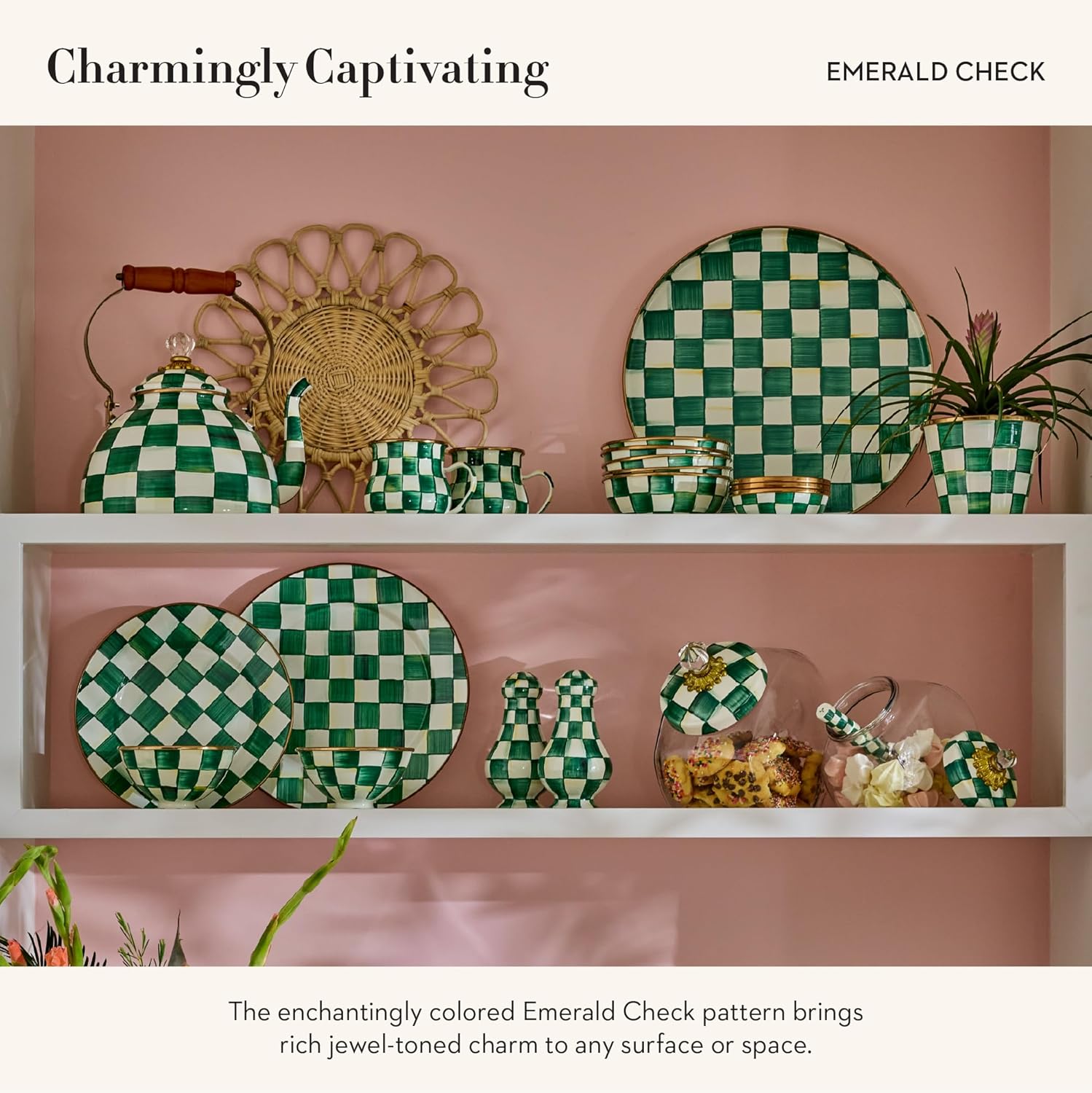- ENTERTAINING ESSENTIAL: Serving dishes for entertaining donโt get any more charming than this. Our Emerald Check food platter features a hand-painted green-and-white checkered pattern, a heavy-gauge steel underbody, and a bronzed stainless-steel rim.