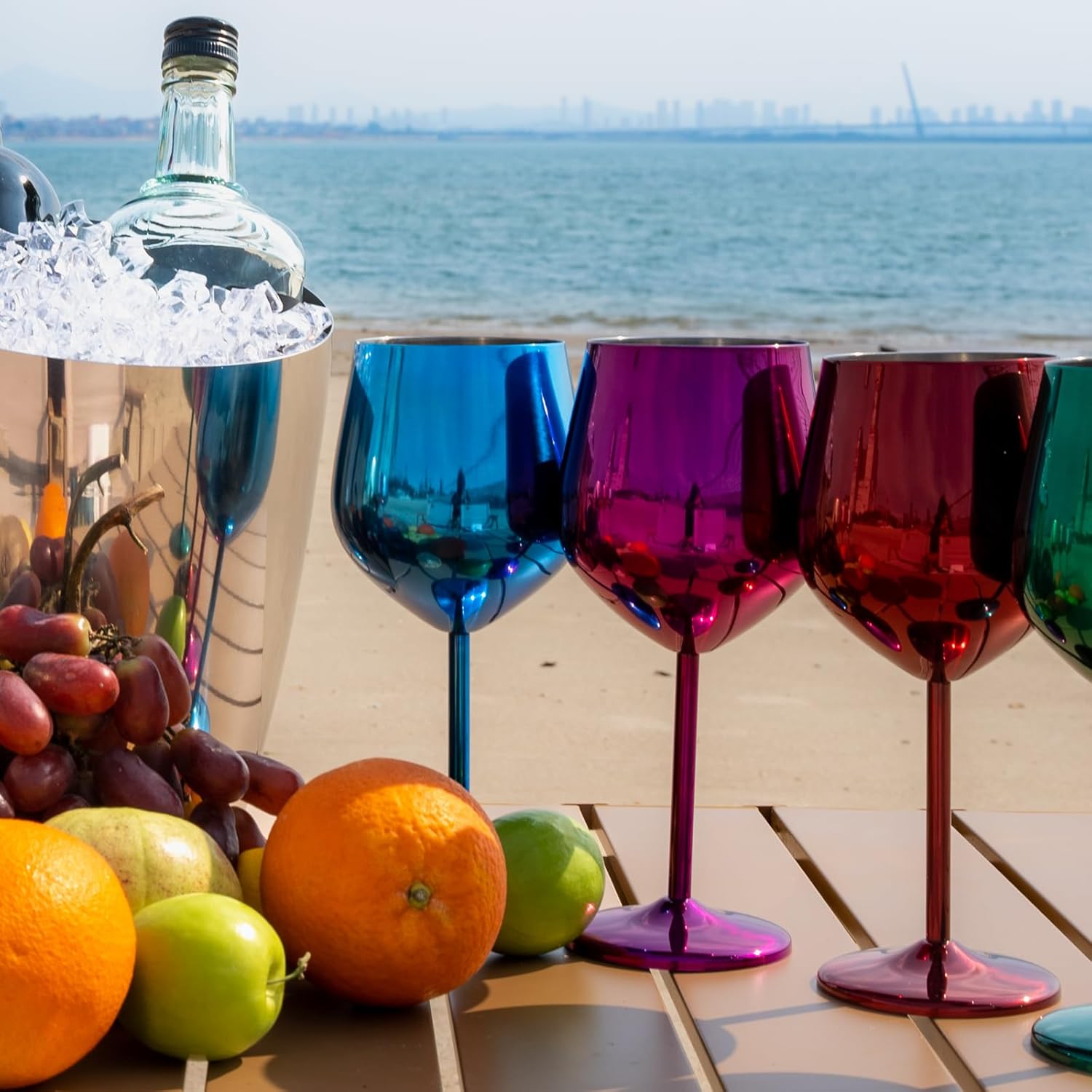 - Elegant Design - Expertly hand-polished to perfection, these stainless steel wine glasses feature a luxurious electroplated finish with a sophisticated metallic sheen. The large capacity 18 ounces capacity and weighted flat base provide exceptional stability, while the graceful long stem enhances both visual elegance and practical functionality - allowing you to swirl your wine with confidence to fully release its aromatic bouquet