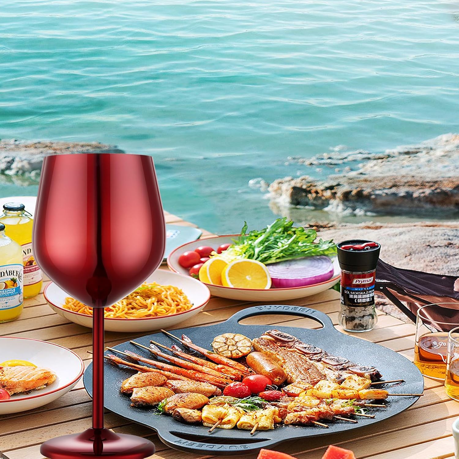 - Elegant Design - Expertly hand-polished to perfection, these stainless steel wine glasses feature a luxurious electroplated finish with a sophisticated metallic sheen. The large capacity 18 ounces capacity and weighted flat base provide exceptional stability, while the graceful long stem enhances both visual elegance and practical functionality - allowing you to swirl your wine with confidence to fully release its aromatic bouquet