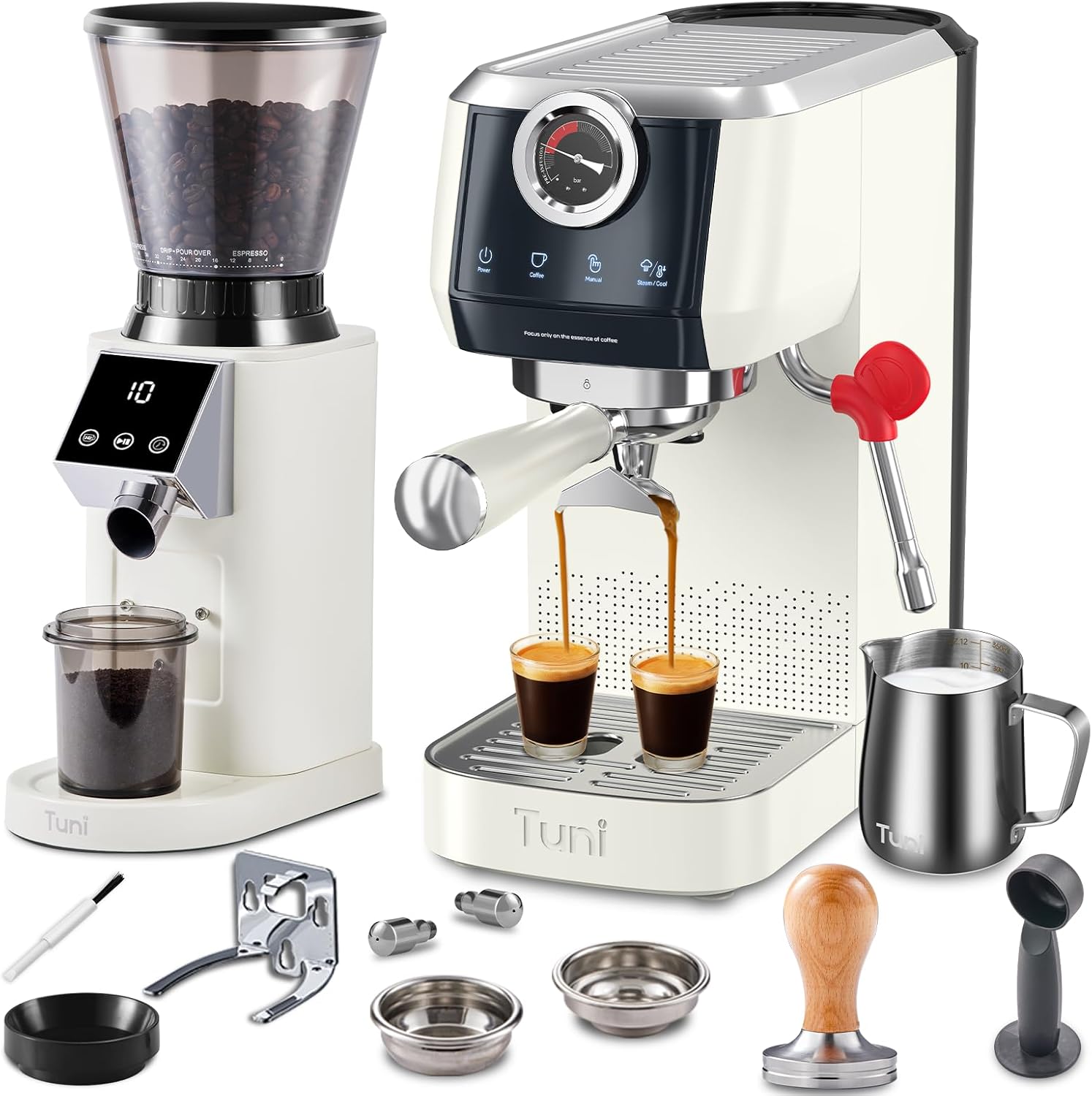 Tuni E2 58mm Espresso Machine and G1 Ivory Conical Burr Coffee Grinder Combo, 20Bar Dual Boiler Coffee Maker with 10mm Steam Milk Frother, 48 Grind Settings Anti-static Burr Mill