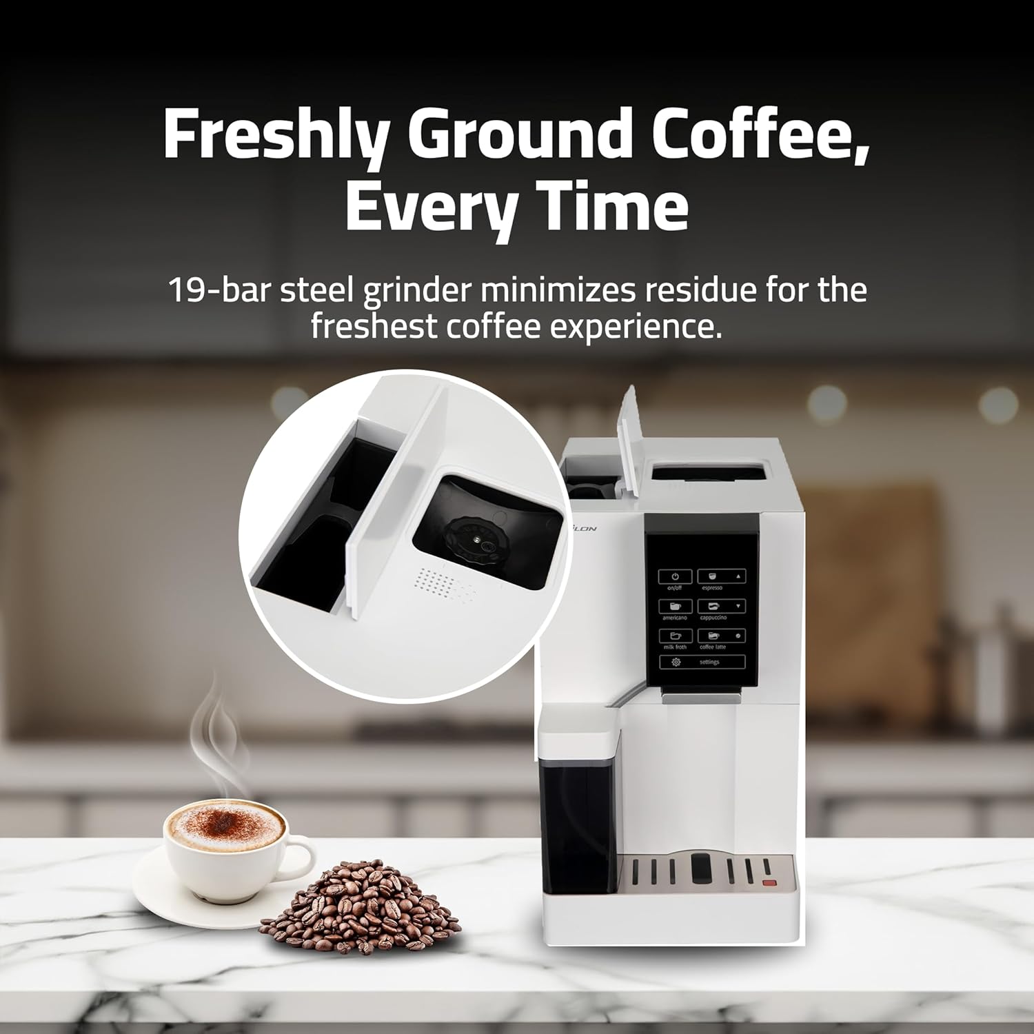 Epsilon Fully Automatic Coffee Machine, Modern One Touch Espresso Machine, Integrated Milk Frother and Custom Brewing Cafe Maker, Compact Countertop Size, Self Cleaning Cafetera (White)
