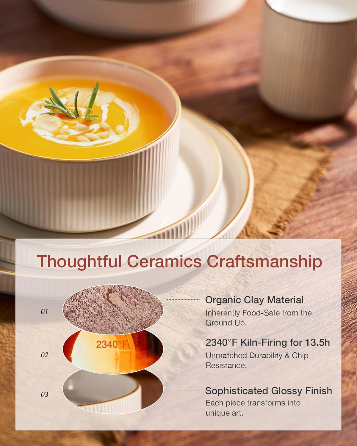 - [Attractive Design]: Featuring a sophisticated glossy finish and hand-painted rims, this dish set combines elegant texture from its ribbed fluted edges with a versatile neutral palette to elevate any tablescape