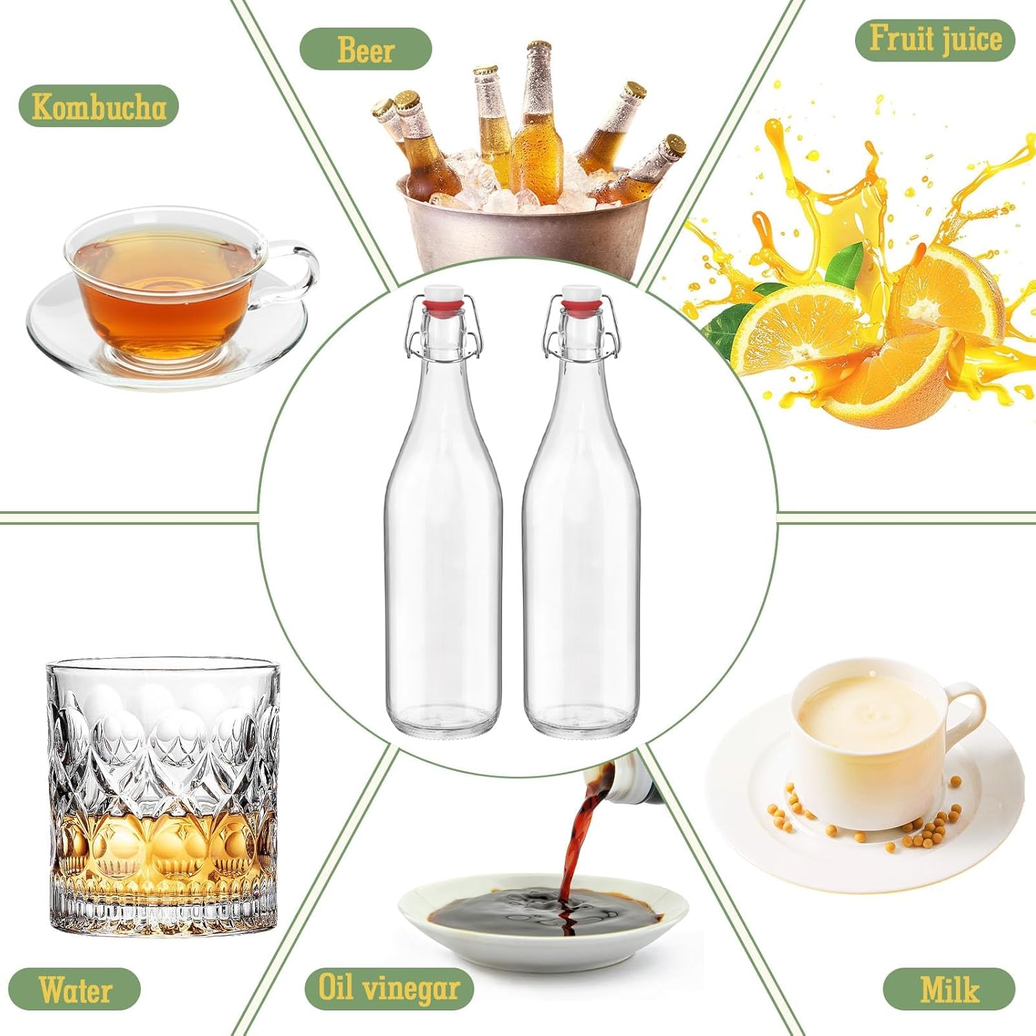 - Versatile & Multi-Purpose Use: Perfect for storing juices, vinegar, oils, kefir, wine, liquor bottles, and more. The 1 liter glass bottle capacity is ideal for home brewing, parties, or everyday use. Includes a stainless steel funnel and 2 pourers for easy filling and serving. Great for mead bottles, limoncello bottles, and kombucha jars.