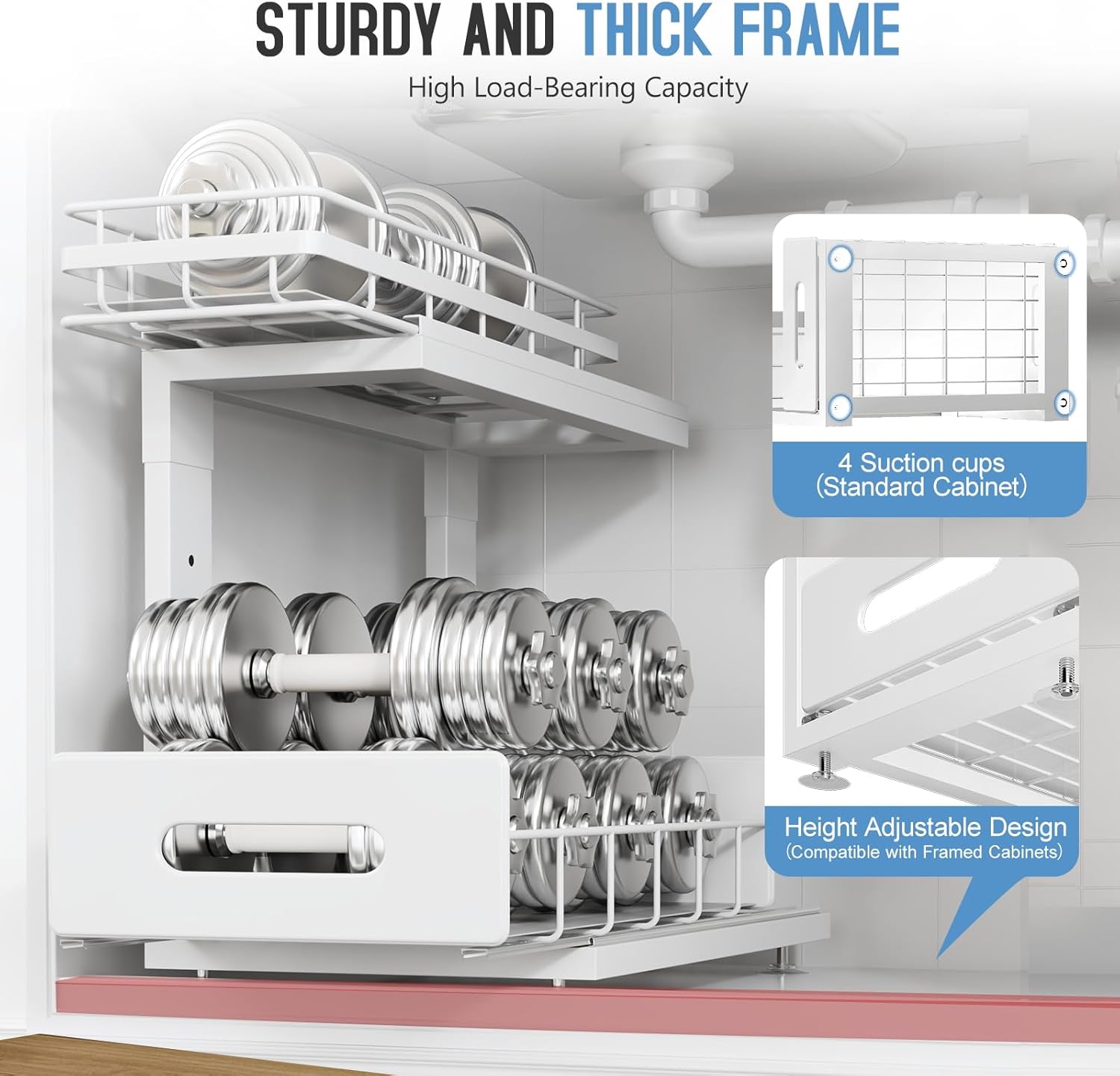- 【Height Adjustable for Custom Fit】Customize the height of each tier to fit items of varying sizes and adapt to different cabinet heights. Perfect for organizing tall bottles, cleaning supplies, or toiletries under your sink, while providing a versatile storage solution that fits both small and large under-sink spaces in your kitchen and bathroom.