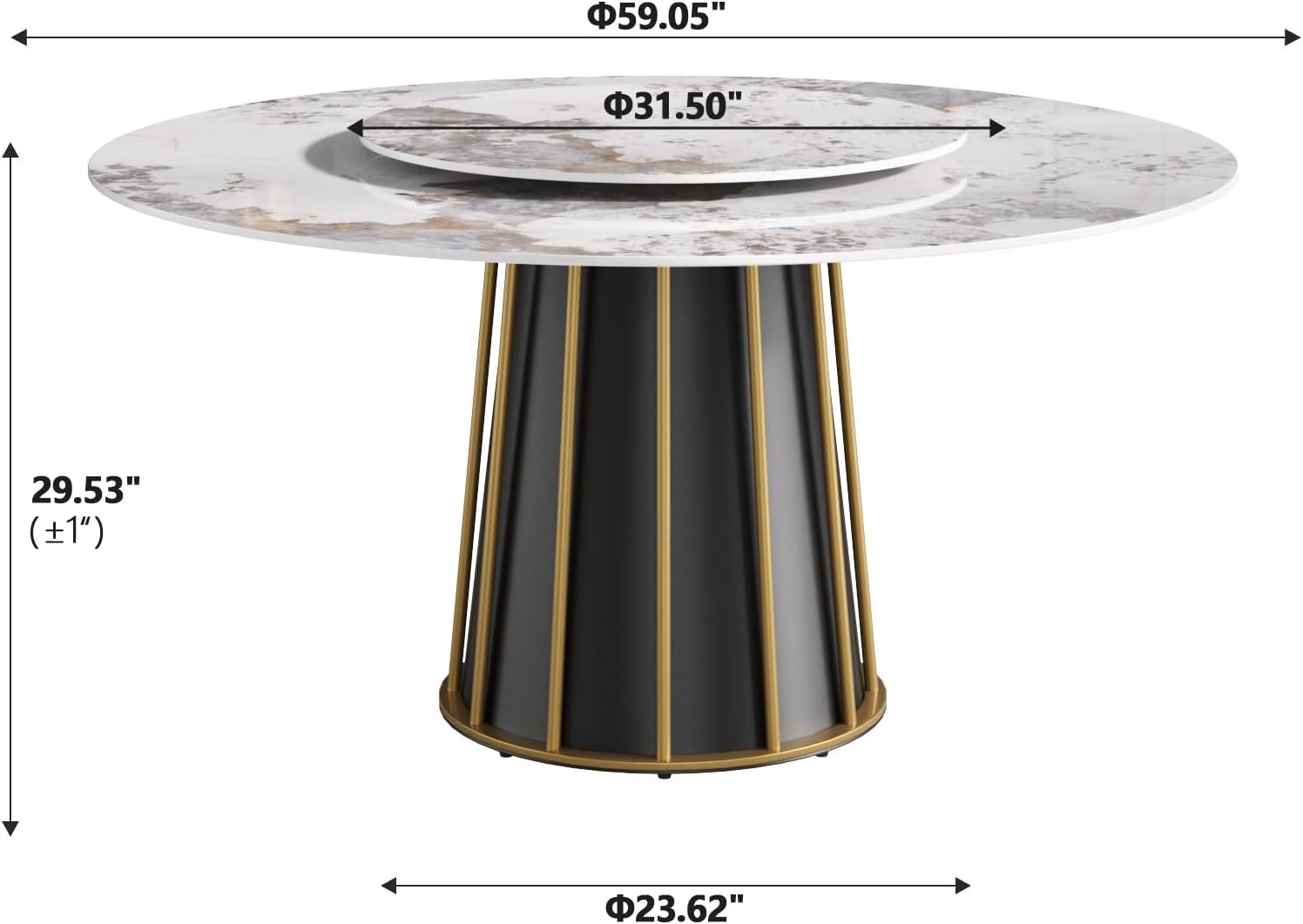 Montary 59" Modern Artificial Marble Round Dining Table with Metal Iron Base & 31.5" White Sintered Stone Turntable, Dining Room Table with Lazy Susan for 6-8 (Only Table)