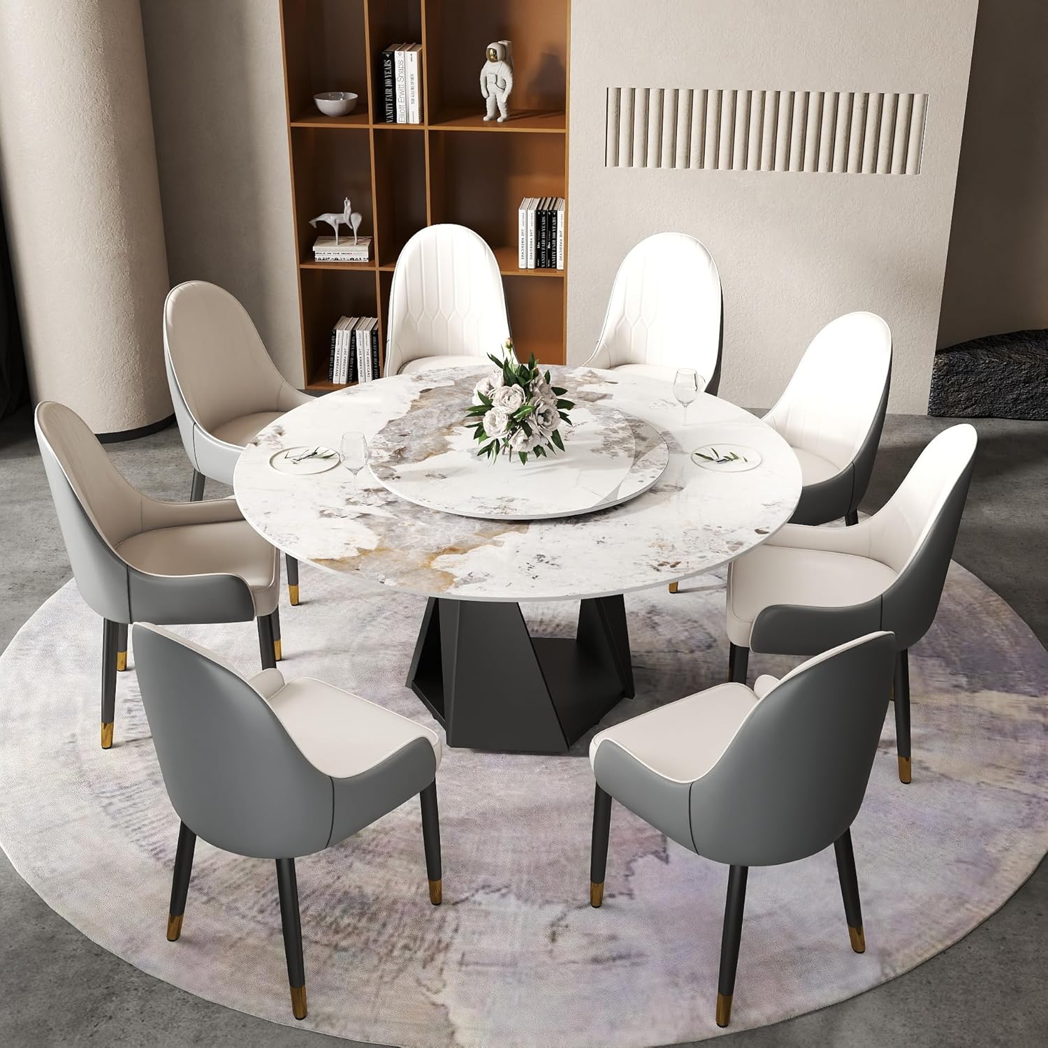 Montary 9 Piece Dining Table Chairs Set, Modern Dining Table Set of 8, Includes 59" D Marble Round Table with Black Iron Metal Base, 8 Gray White Dining Chairs for Home, Kitchen