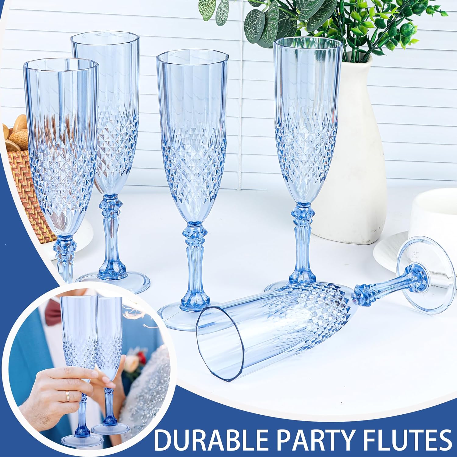 - Charming Set: Champagne flutes set include 48 retro-style blue champagne plastic wine glasses, providing ample quantity to meet your daily use and replacement needs. A suitable champagne cup is the icing on the cake. Plastic wine glasses not only carry the wine, but also carries the laughter and blessings