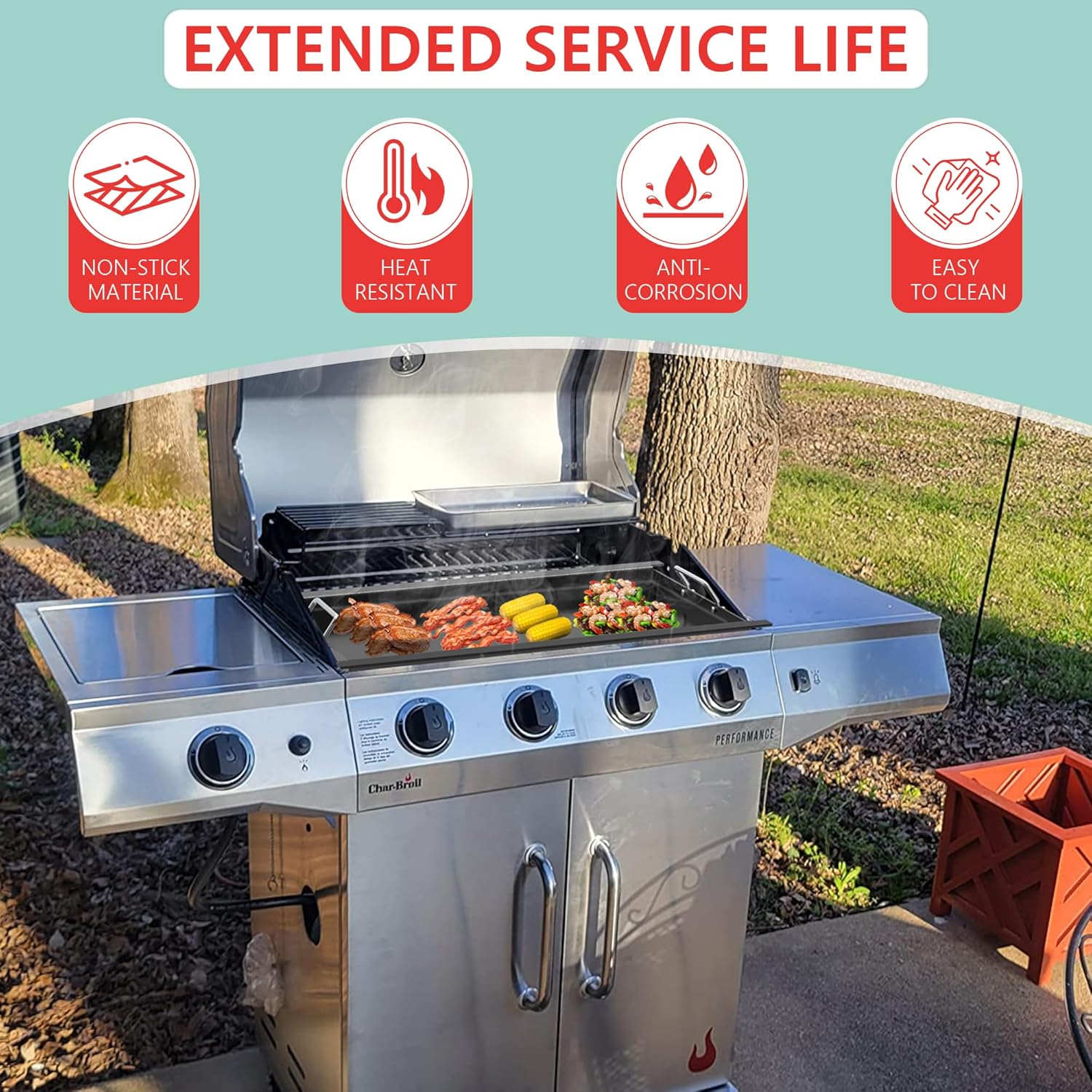 - Crafted from durable carbon steel for excellent heat distribution and even cooking, this versatile flat top griddle is designed for long-lasting performance, it used as a gas griddle flat top grill to transform your outdoor cooking setup; ,Griddle insert for gas grill measures 26.2'' L x 17'' W, providing ample cooking space. Your order includes 1 griddle insert, 2 carrying handles and 2 silicone gloves.Please confirm the size and model you need before placing your order!