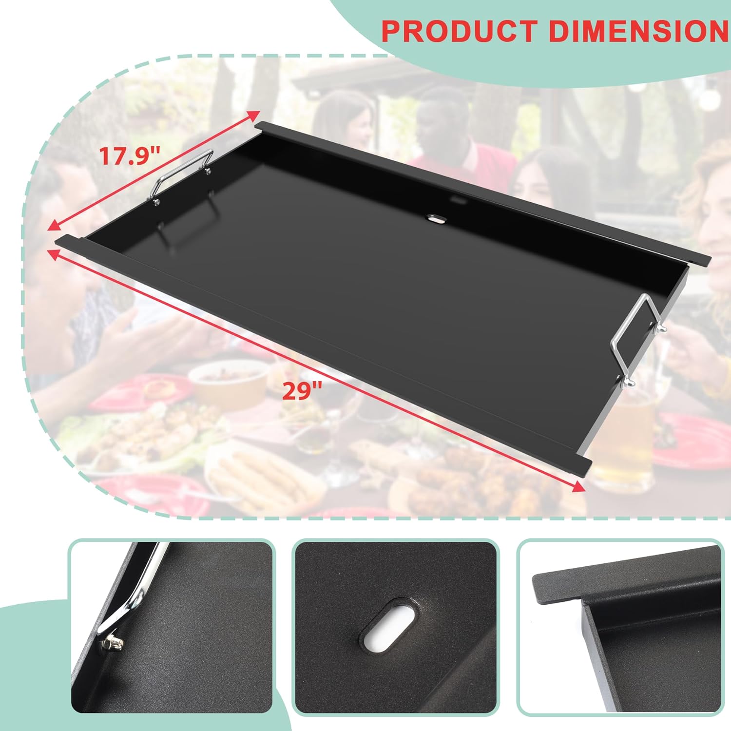 - Crafted from durable carbon steel for excellent heat distribution and even cooking, this versatile flat top griddle is designed for long-lasting performance, it used as a gas griddle flat top grill to transform your outdoor cooking setup; Griddle insert for gas grill measures 29''L x 17.9''W; providing ample cooking space. Your order includes 1 griddle insert, 2 carrying handles and 2 silicone gloves.Please confirm the size and model you need before placing your order!