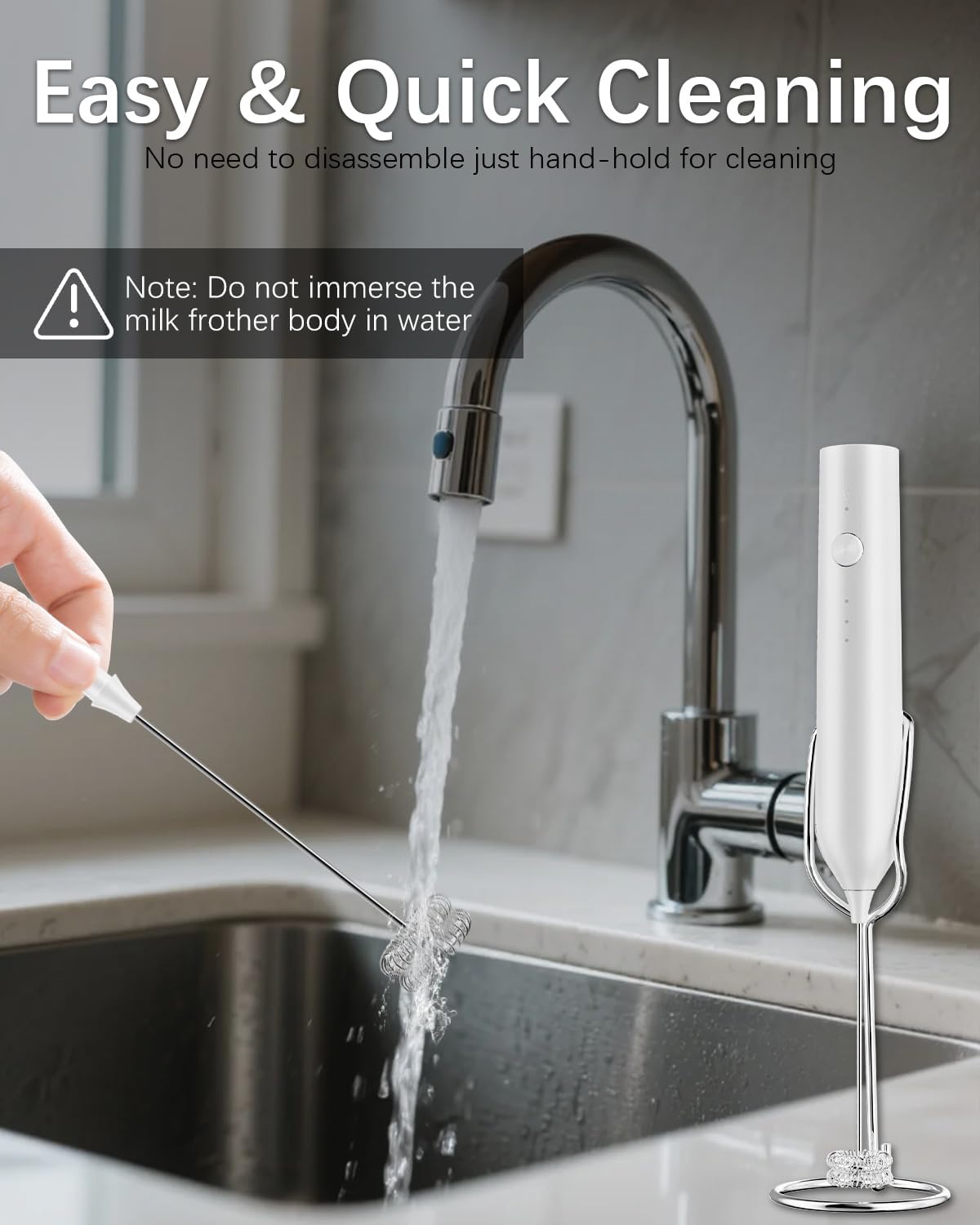 - Easy to Clean and Store: To clean this electric milk frother handheld with stand, simply place the whisk under water and briefly turn it on to get rid of any residue.When not in use, our electric whisk can easily fit in your bag or in your kitchen drawer.Please note that the body of the coffee frother handheld is not waterproof, so do not immerse it in water.