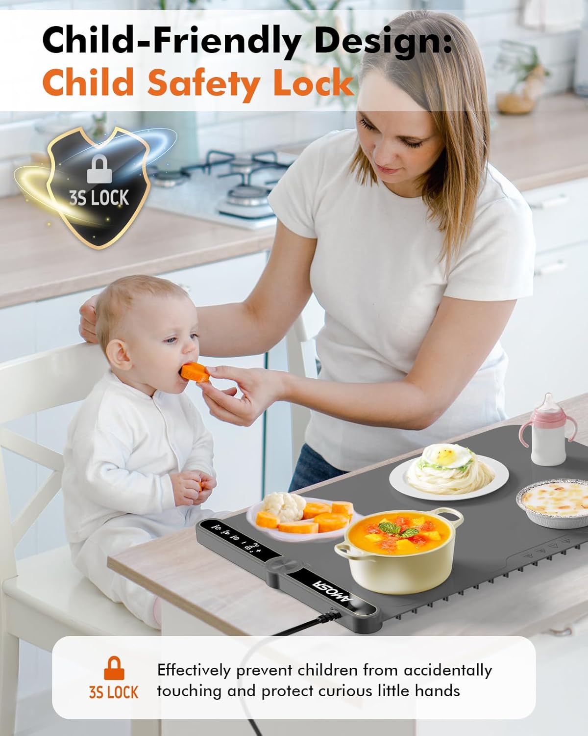 - 【What You Get】AMOSA Electric Food Warmer*1, Power Cord*1, Silicone Straps*1, Storage Bag*1, Placemat*1, User Manual*1, AMOSA up to 24-month after-sales service, and 7-day/24-h friendly customer service. If you have any problems, we will 100% solve them.
