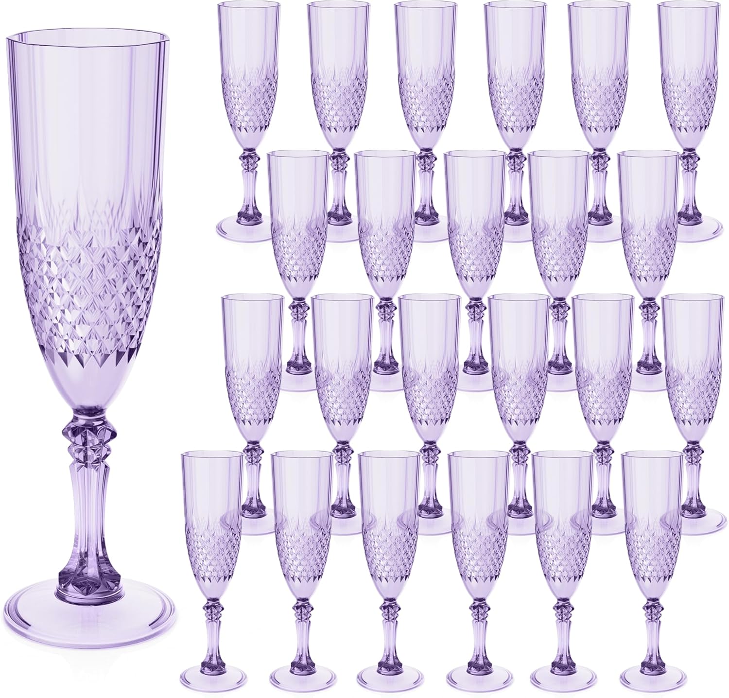 - Charming Set: Champagne flutes set include 24 retro-style light purple champagne plastic wine glasses, providing ample quantity to meet your daily use and replacement needs. A suitable champagne cup is the icing on the cake. Plastic wine glasses not only carry the wine, but also carries the laughter and blessings