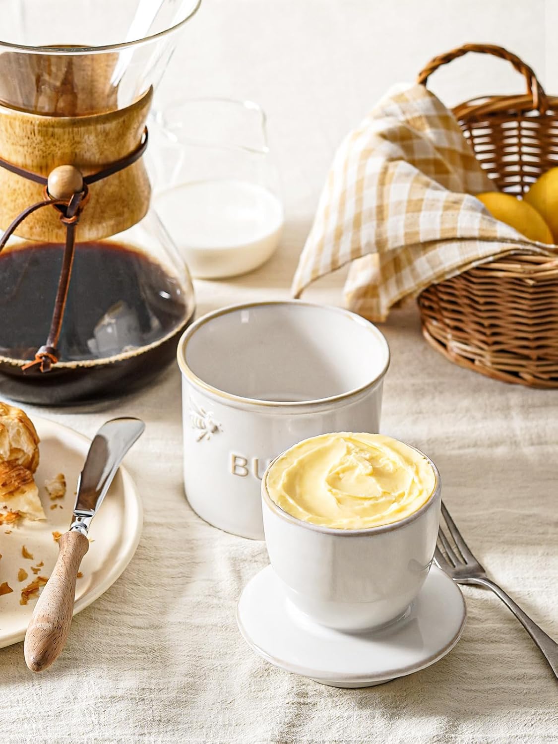 - Exquisite Counter Decorations: Featuring an arctic white glaze adorned with a cute bee pattern, this farmhouse-style ceramic butter crock will infuse warmth and activity into your counter. Its cute and natural design suits various home styles. It's also the ideal present, whether for a housewarming celebration, Thanksgiving, Christmas, or a birthday, it will be an amazing choice